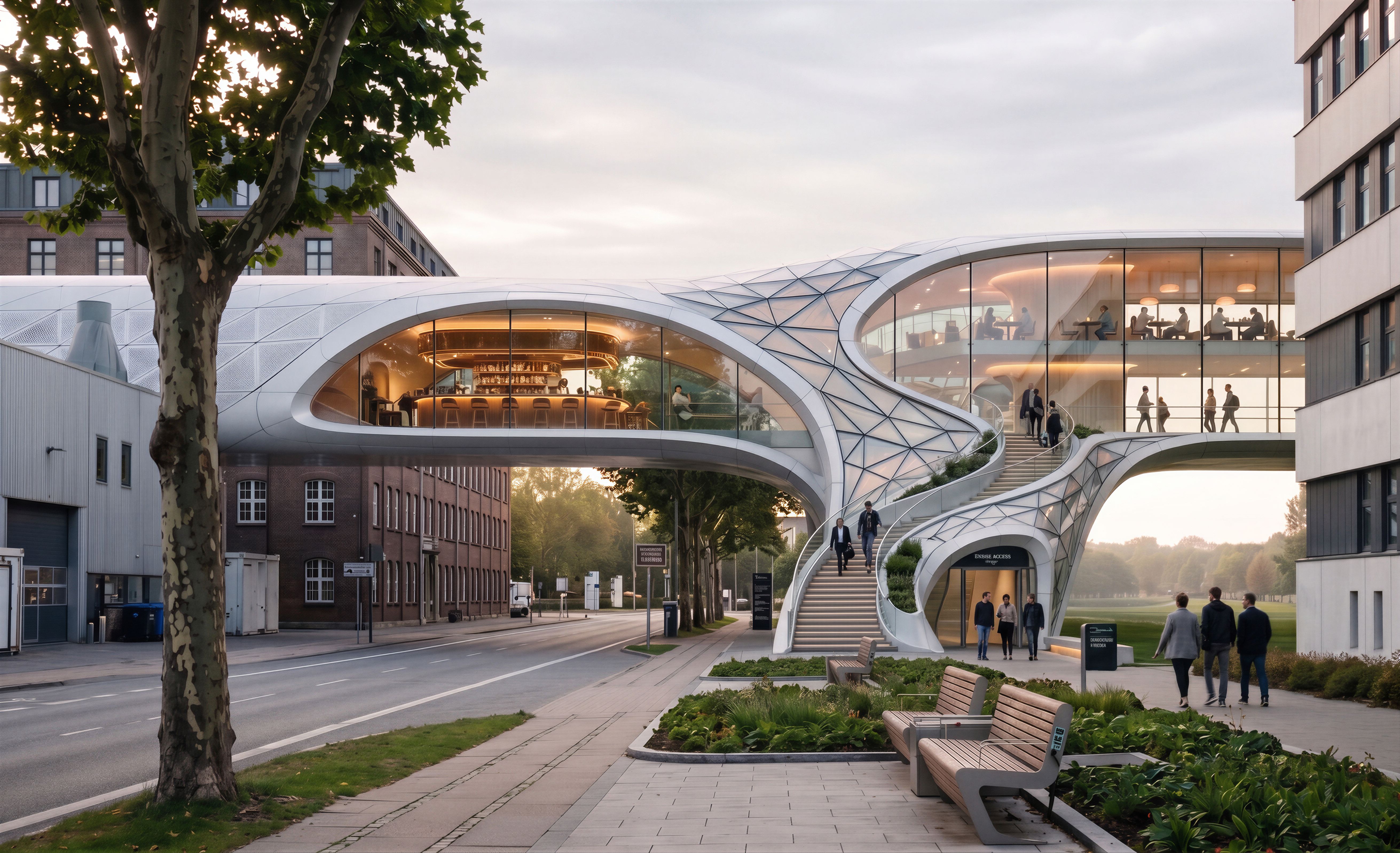 edit this image. REMOVE THE BACKGROUND OF THE MODERN ERGONOMIC BUILDINGS BEHIND THE WHITE GLASS BRIDGE AND ADD SKY AND TREES. MODIFY THE WHITE ERGONOMIC GLASS BRIDGE STRUCTURE, AND INSERT A STAIRWAY TO ACCESS THE FIRST FLOOR OF THE BRIDGE IN ERGONOMIC STYLE AND INTEGRATED WITH THE SHAPE OF THE STRUCTURE THAT DESCENDS TO THE GROUND ON THE SIDEWALK, SO THAT PEOPLE CAN WALK FROM THE SIDEWALK AND EASILY CLIMB ONTO THE BRIDGE., keep exact camera angle