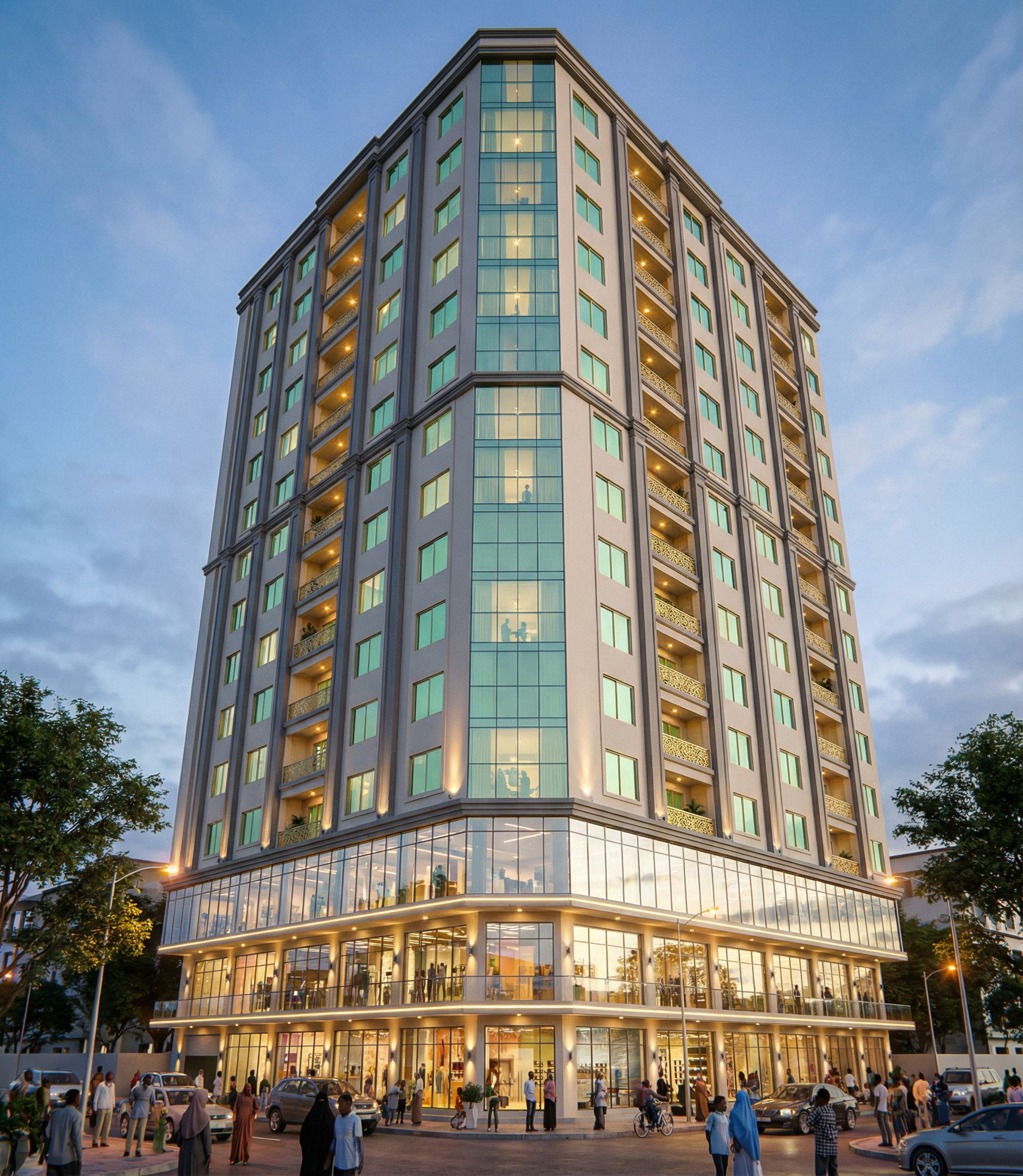 Make a render of an apartment building of 20 stories with ground floor, first floor and second floor commercial and third to twentieth floors apartments. Make glass light green, reflective and realistic. Turn on the lights in the building.Include people of African and Somali origin in the image. Use some spot lights, rope lights and street lights on the . Use the combination of colours in the reference image. Make beams, columns and mouldings the darker. Use curtain walling on first and second floors and at the corner of the building slitghtly touching both facades all the way to the top. Use mashrabya indicated on reference image 2 on balconies. Make glass clear, reflective and realistic. Extend curtain walling to cover two rows of widows on either sides., keep exact camera angle