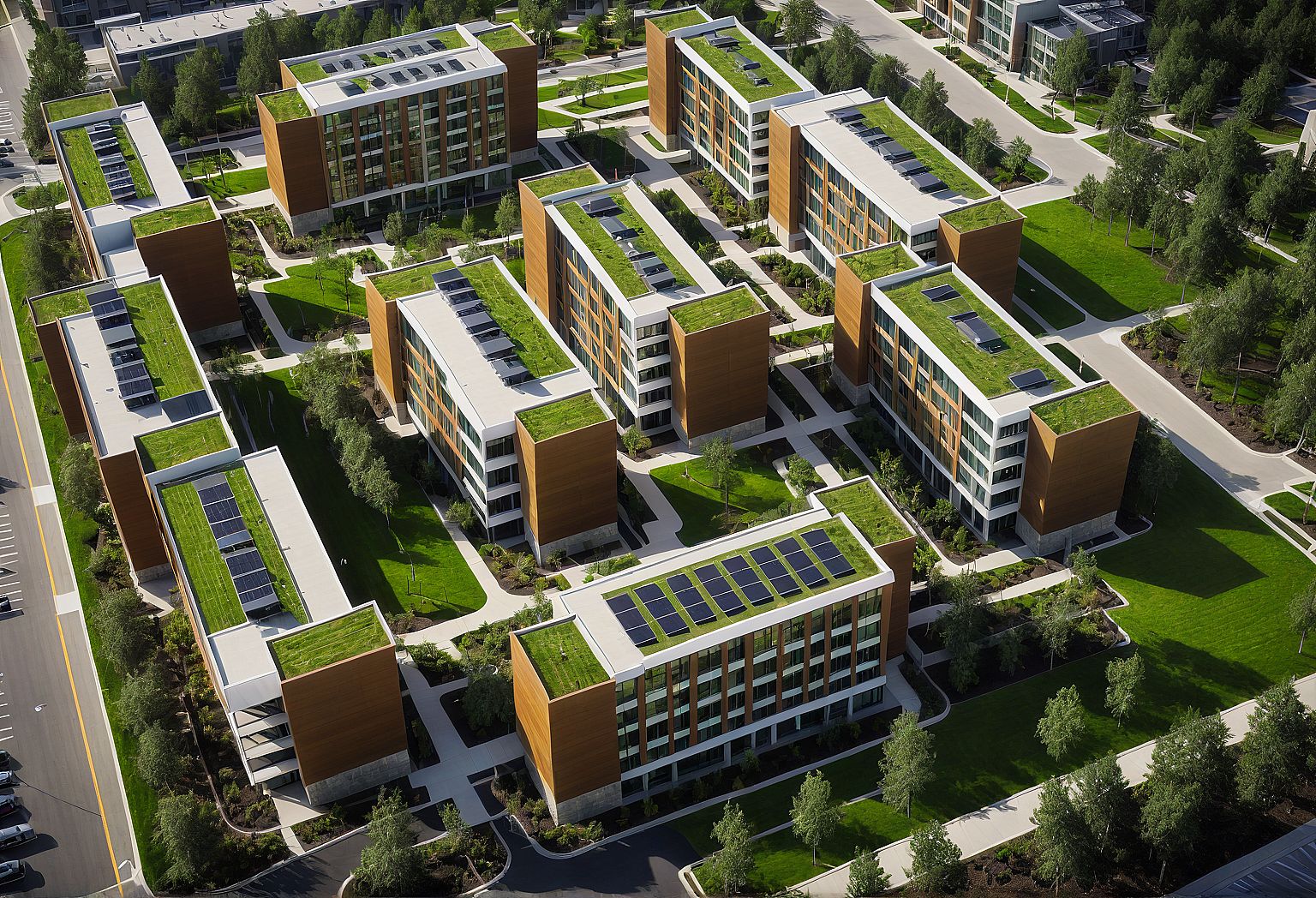 PromptPhoto of a modern multi-unit residential-student complex layout featuring, flat roof - interconnected sleek modern design buildings, emphasizing modular design with flat roof. Surrounding green spaces with pedestrian pathways adjoining the buildings. Architectural details include white clean walls and stone pitching on protruding stair volumes, structured balconies, large windows, and vibrant landscaping with trees and pathways. Urban setting includes parking areas around and surrounding the structures in a suburban context of a university. Optimal natural lighting highlights textures and shadows during late afternoon. Captured from a bird's-eye view with a wide-angle lens, framing the entire complex and showcasing its symmetry and integration with the environment.