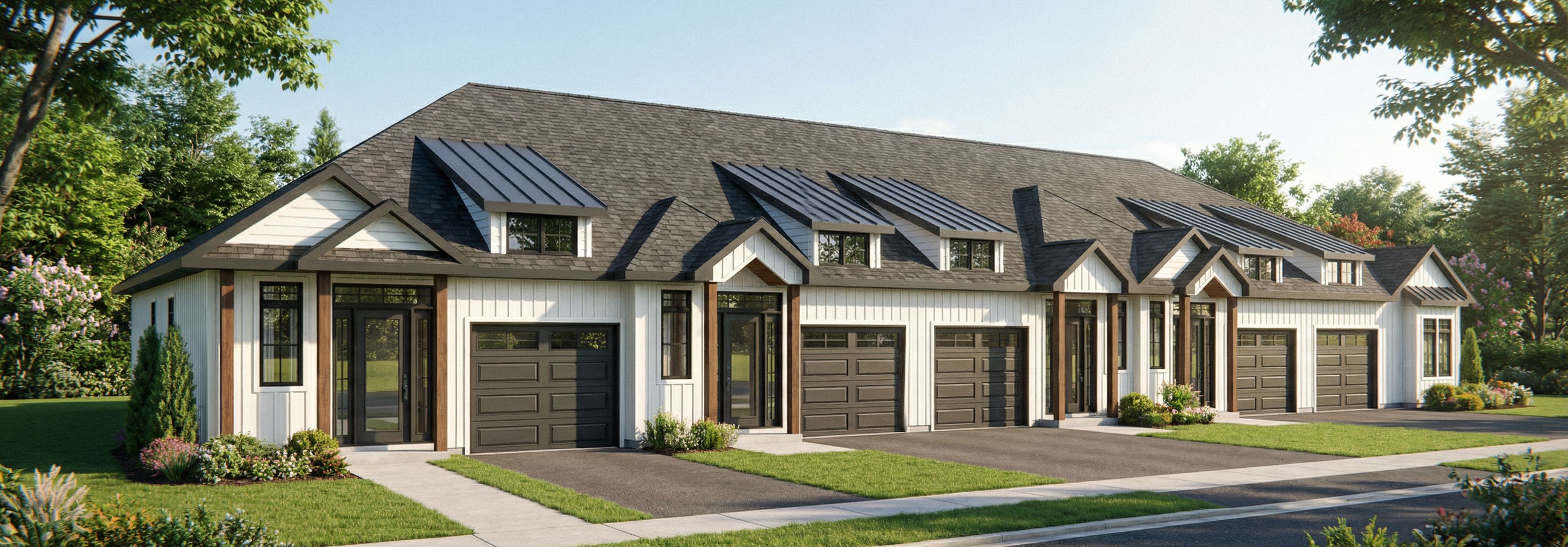 Photo of a row of modern townhouses featuring a mix of black roofing and light-colored siding. Architectural details include large front windows, decorative columns framing entries, and garage doors set within a clean facade. Do not show any stone, Located in a suburban environment with manicured grass and a paved walkway. Natural lighting with soft midday shadows casts a warm glow on textures. The perspective is slightly elevated, focusing on the symmetry of the building, emphasizing depth with a 35mm lens for a wider field of view., keep exact camera angle