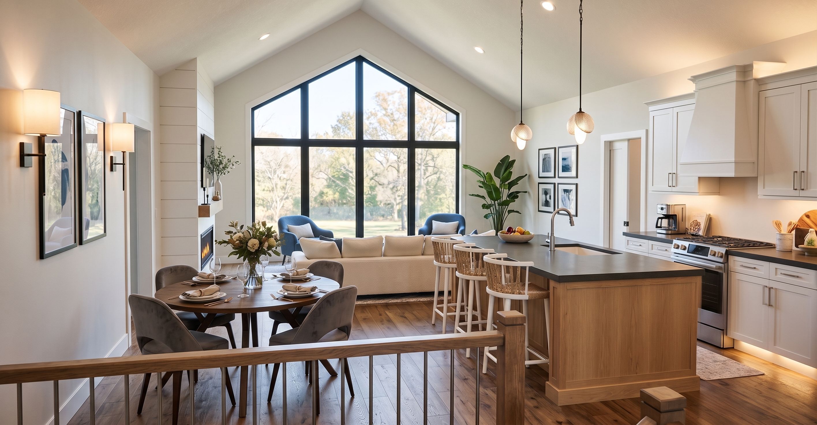 PromptPhoto of a modern open-concept living space, featuring a spacious living room with a large, vaulted ceiling and expansive windows that offer vibrant natural light. Emphasize the juxtaposition of warm wood textures against sleek cabinetry and stainless steel appliances in the kitchen area. Include stylish furniture elements like a round dining table and comfortable sofas. The scene is set in a cozy, inviting atmosphere during the afternoon light, casting soft shadows. Captured from a slightly elevated angle with a wide lens to encompass the entire flow of the layout, highlighting its harmonious design. Millwork range hood in white to match cabinets, shiplap fireplace accent, white pocket door to hall near kitchen, cozy home, nice high end decor, turn on all lights, under valance lights, keep exact camera angle