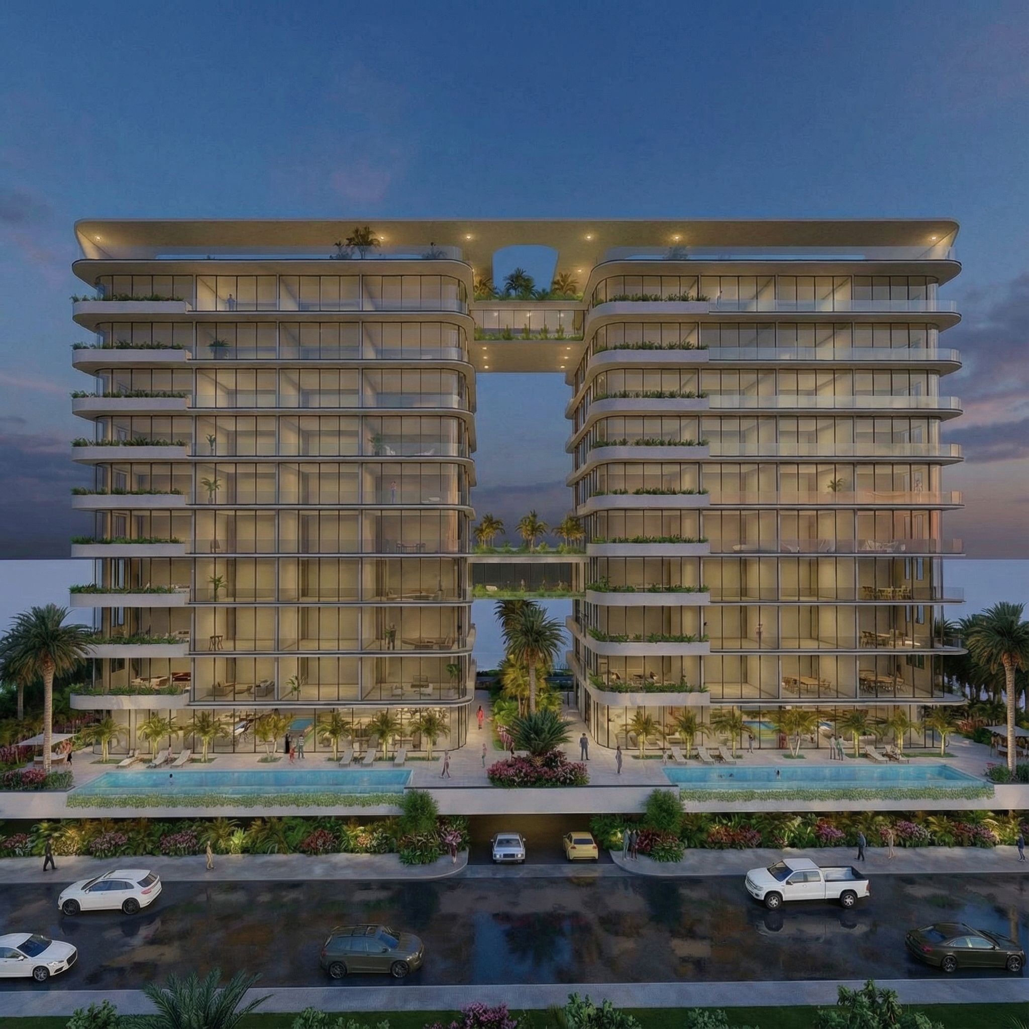 urban masterplan visualization, render this 3D mass into photorealistic rendering, Photo of a modern residential complex featuring two interconnected towers with extensive glass facades, lush balconies adorned with greenery, and sleek white concrete accents. The surrounding landscape includes tropical palm trees and vibrant flower gardens. Captured in natural daylight, the scene showcases soft shadows and sunlit reflections on the glass. The viewpoint is straight-on, emphasizing the building’s symmetrical design, with a focus on sharp lines and materials, framed through a wide-angle lens to enhance the architectural detailing of the structure., keep exact camera angle, dusk atmosphere with soft lighting, high quality, professional, detailed scene