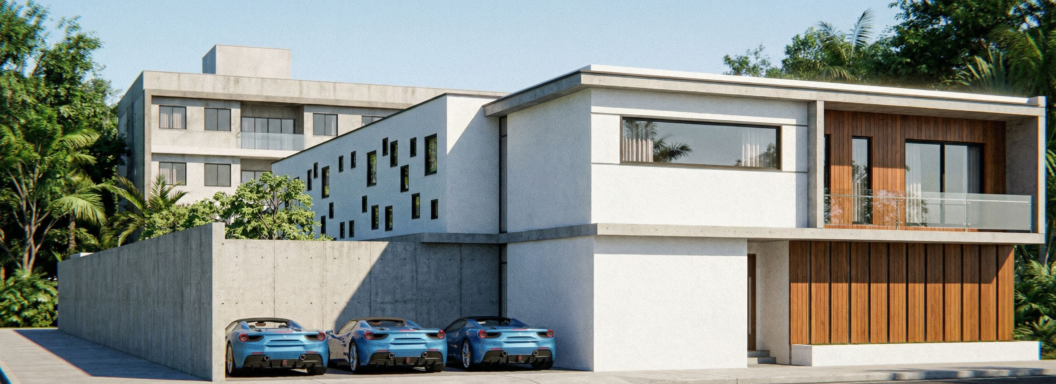 **Textual translation architectural register:** Generate a photorealistic architectural photograph based exclusively on the attached image. Maintain the layout, viewpoint, and façade strictly unchanged, faithfully interpreting colors, materiality exposed concrete, laminated glazing, ipê timber, textured paint, and all existing overlays. The surroundings must include organic tropical landscaping with vegetation typical of Brazil only as a background setting, without encroaching on the façade. If adjacent houses are present, they must be preserved. Lighting must replicate realistic tropical daylight, and the final output must read as an ultra-sharp 8K real photograph, as if captured with a 16 mm wide-angle lens, f/4, ISO 100, with no rendered appearance. **CRITICAL — NON-NEGOTIABLE:** The camera angle must be exactly identical to the source file. Do not alter the framing under any circumstances. Strictly follow the original perspective. **CRITICAL — NON-NEGOTIABLE:** Add asphalt only around the buildings and new sidewalks solely if there is a clear indication in the image. **CRITICAL — NON-NEGOTIABLE:** Carefully analyze colors, textures, and materials, applying them exactly as specified in the project. Do not modify or introduce any new material. **CRITICAL — NON-NEGOTIABLE:** The site slope, level differences, and ground structure must remain unchanged. Maintain a rigorous and accurate reading of the existing topography. **CRITICAL — NON-NEGOTIABLE:** Do not introduce vegetation where none exists. Do not invent trees, plants, shrubs, flowers, grass, gardens, or any green elements not present in the original image. If a tree exists in the foreground, retain it realistically. If no vegetation is present, keep the ground neutral and bare concrete, soil, or original paving. The addition of landscaping, planters, beds, vines, or decorative planting is strictly prohibited. **CRITICAL — NON-NEGOTIABLE:** Examine the garden planting carefully. Reproduce exactly what is shown, maintaining 100% of the original façade vegetation without alteration. The final result must read as a real photograph taken today, maintaining total fidelity to the submitted design, with no structural, aesthetic, or landscape modifications. , keep exact camera angle