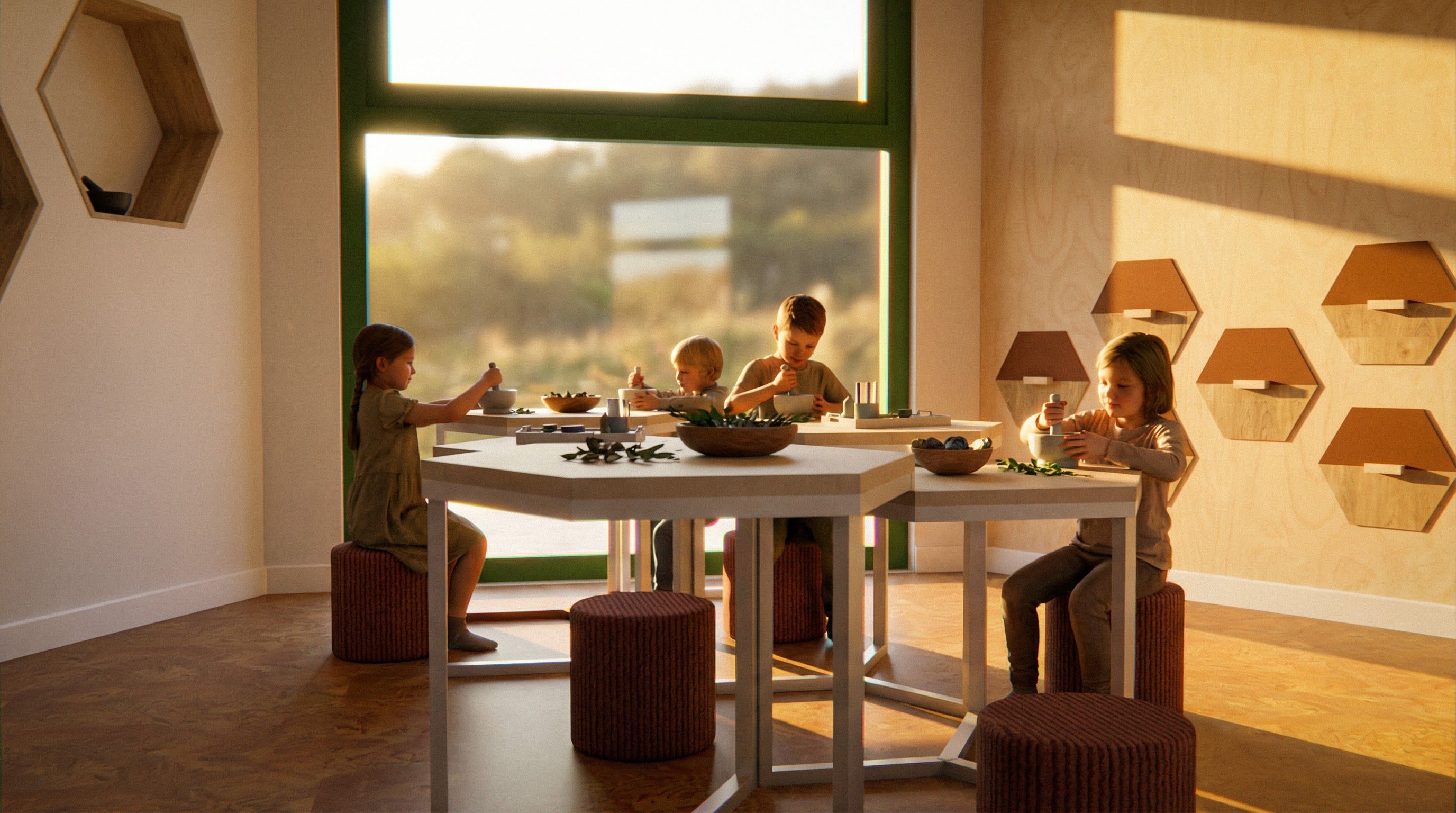 PromptBitte editiere sitzende kinder an die Tische. Dort sollen sie nicht malen sondern Naturmaterial mörsern. Füge bitte keine staffeleien oder objekte in öffnungen oder auf die schubladen. Füße Weiße Fußleisten hinzu. Und passenden Linoleum Boden der im Kontrast steht, keep exact camera angle