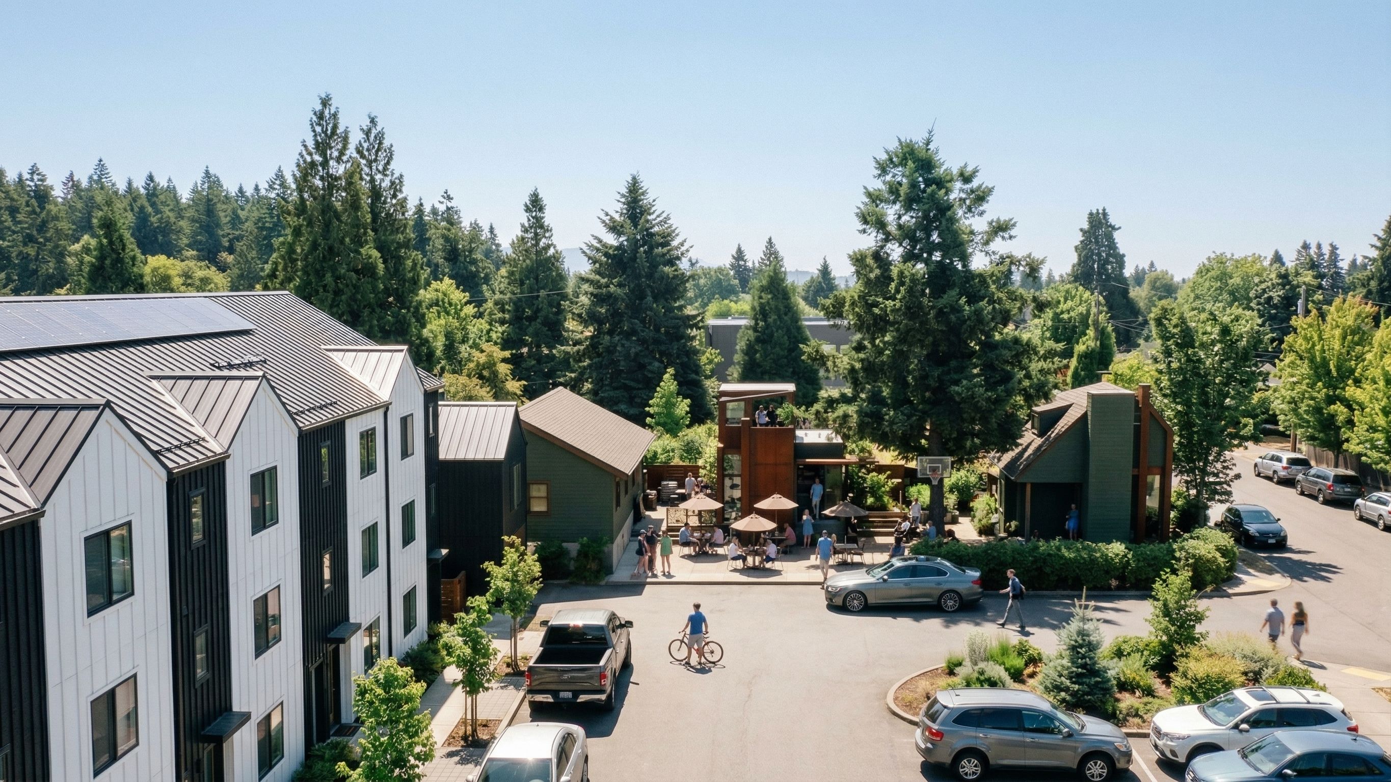 Promptuse rendered image and fill in surroundings as shown. change building left foreground to a three storey townhouse block with black and white vertical siding and remove mountains in background but reuse previous context and siting, keep exact camera angle