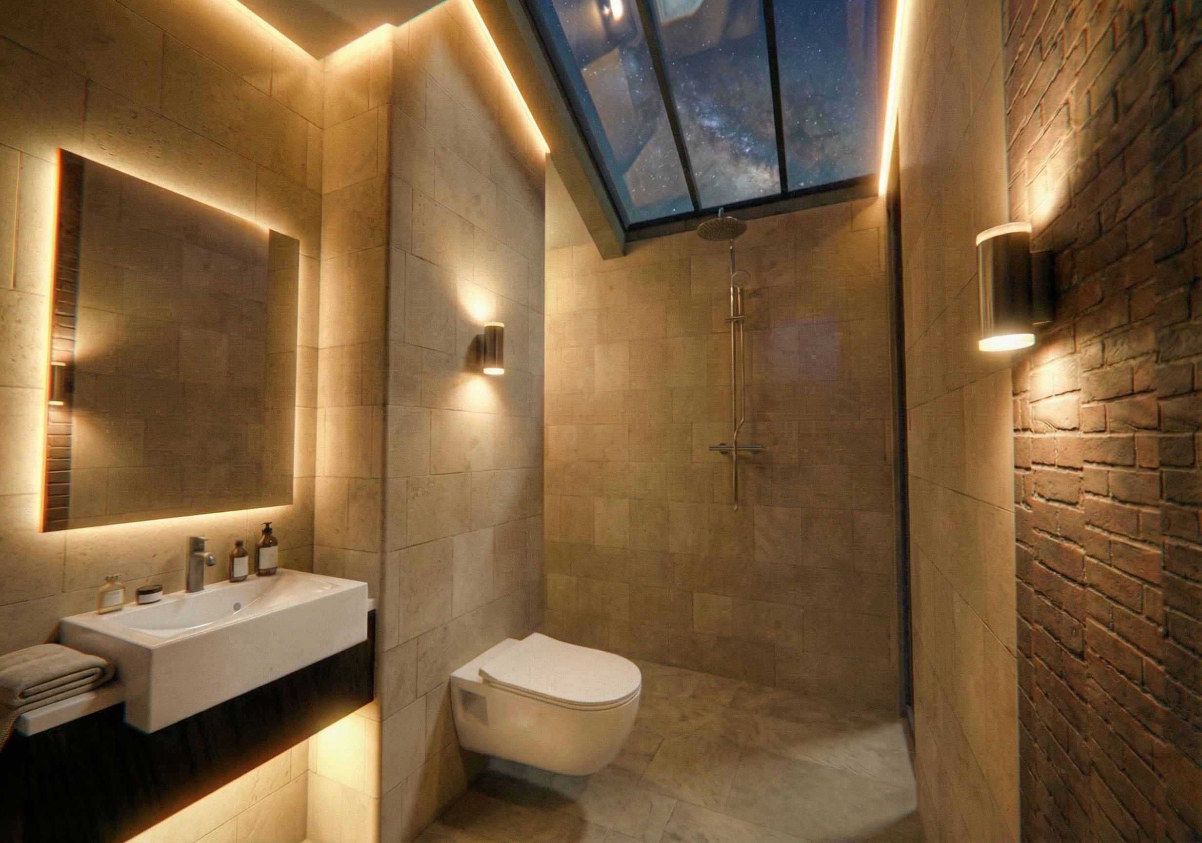 Promptmove the wall mounted light closer to the shower area., right in front of the WC, keep exact camera angle