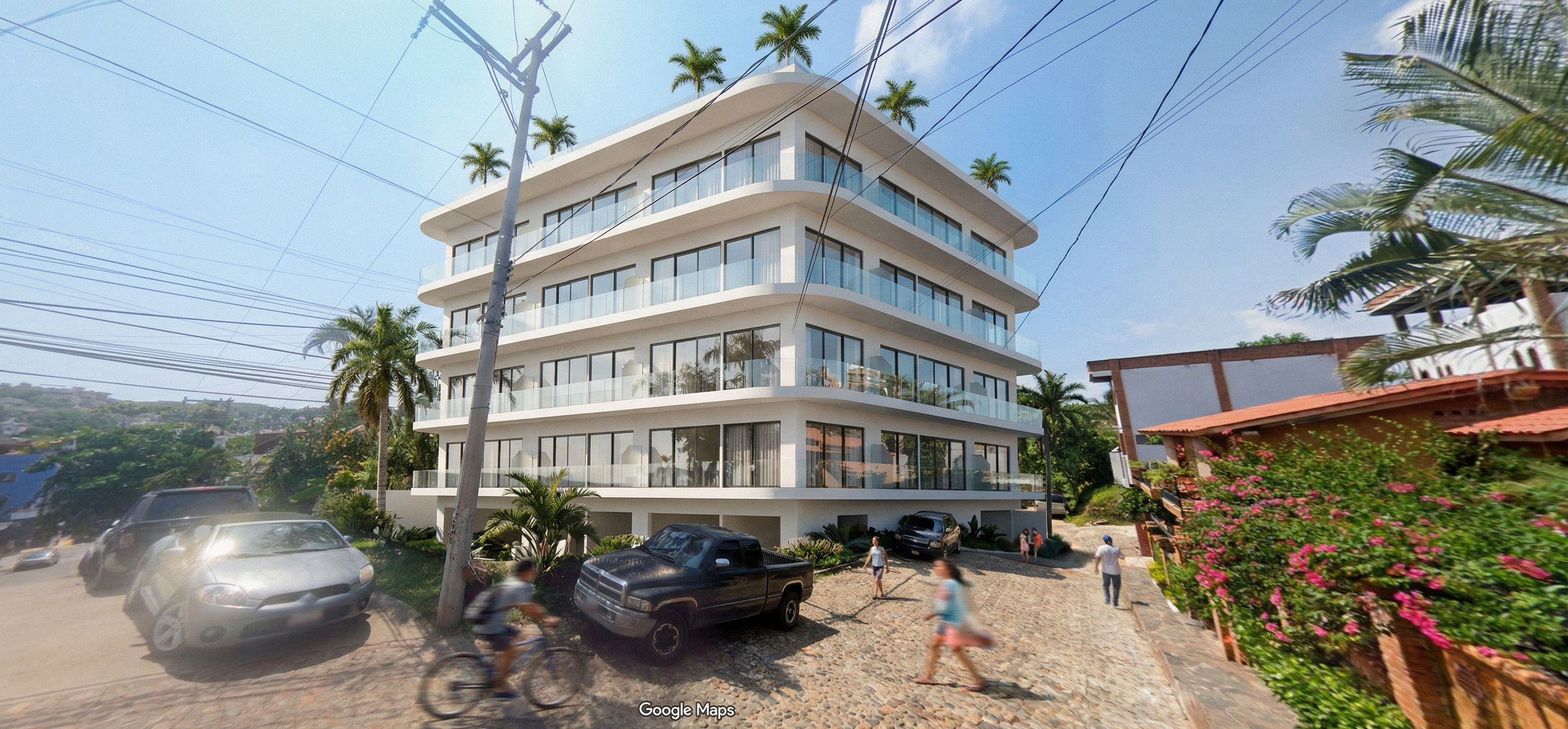 PromptPhoto of a modern multi-story residential building, with elegant glass balconies and large windows. Emphasizes the smooth white facade and contemporary architectural lines. The urban environment shows neighboring structures and green areas nearby, highlighting the texture details. Capture the scene from a low angle using a wide-angle lens, focusing on the interaction of light and reflections on the glass surfaces, showing the vibrant urban life surrounding the building. PLACE IN THE WHITE PART OF THE REFERENCE IMAGE