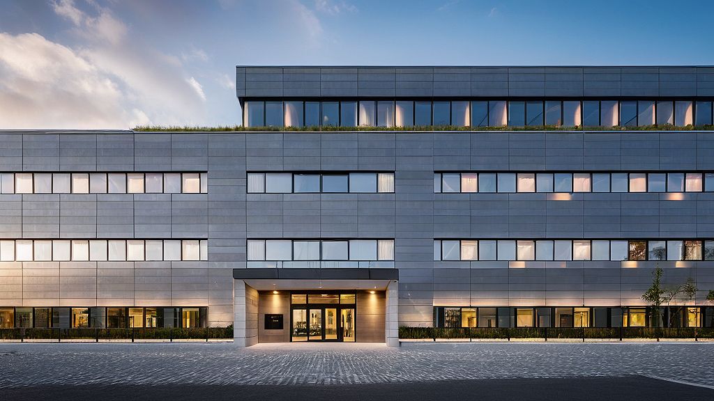 PromptPhoto of an industrial facility, showcasing a modern design with sleek lines and small glass windows. The exterior features a combination of textured gray panels and reflective surfaces, highlighting its contemporary architecture. Surrounded by open landscaping with sparse vegetation and a gravel path, the setting includes nearby industrial elements in the distance. Bright daylight casts soft shadows across the facade, enhancing the building's details. Captured from a low angle to emphasize the height and imposing structure, with a wide lens to include the environment.