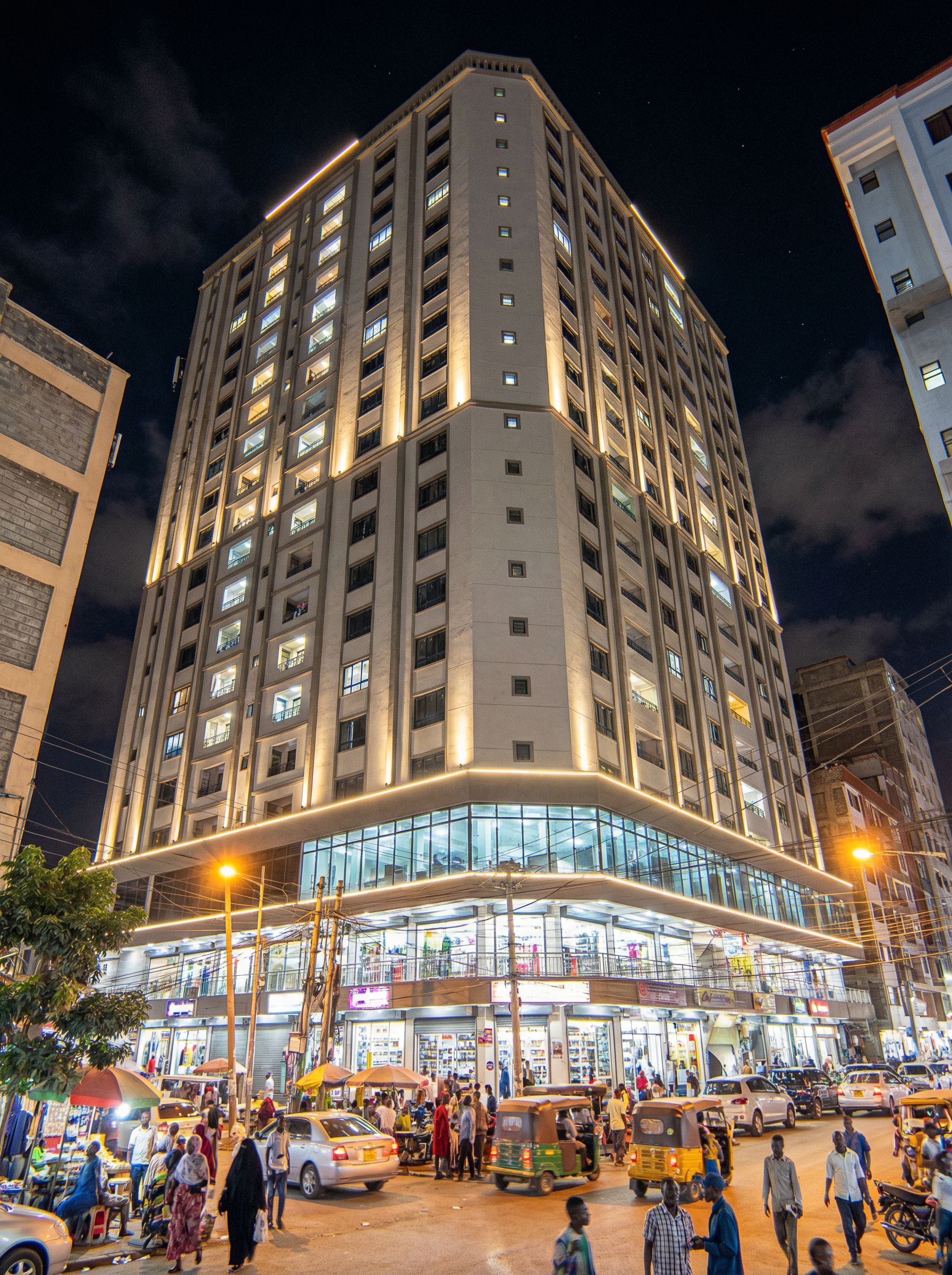 Make a render of an apartment building of 20 stories with ground floor, first floor and second floor commeecial and third to twentieth floors apartments. Make glass clear, reflective and realistic. Turn on the lights in the building. Building is commercial area of eastleigh in nairobi kenya. Include people of African and Somali origin in the image. Use some spot lights, rope lights and street lights on the image. Use the combination of colours in the reference image. Make beams, columns and mouldings the darker colour. make the middle part halfway grey. Try the combination of colours in reference imafe 2., keep exact camera angle