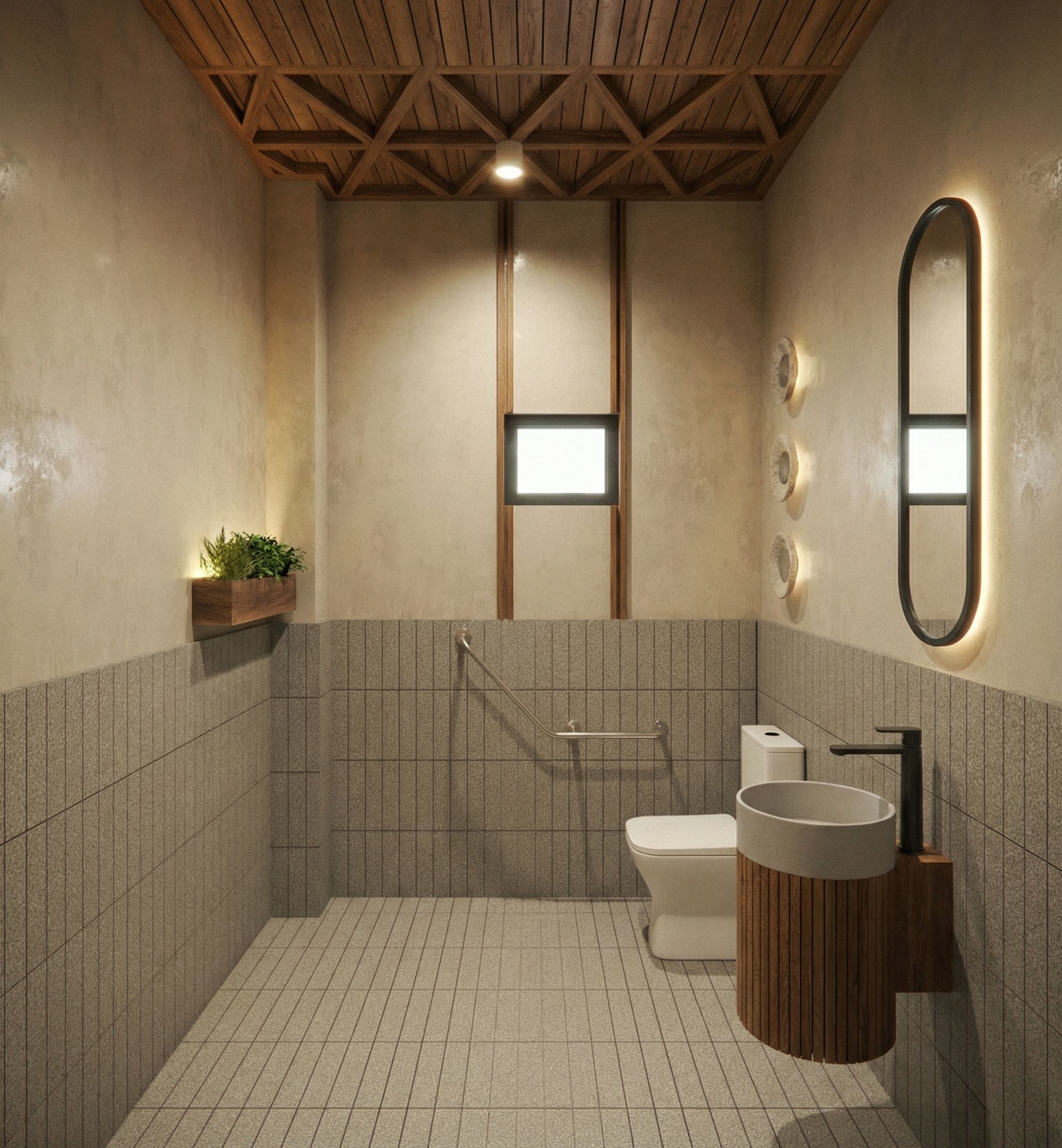 PromptPhotorealistic rendering of a public restroom located in Plaza Paseo Rocaval, in San Cristóbal de las Casas, Chiapas.Organic, natural, and contemporary style, with a warm, realistic, and slightly theatrical atmosphere.The existing restroom layout must be fully respected.Materials and finishes: 7 x 30 cm ceramic tile flooring with a medium gray granite-look finish, also used on walls and wainscoting up to 1.20 m high, with a 3 mm visible grout joint. Upper walls finished with a chukum-type paste in a natural tone with a smooth, handcrafted texture.Sink and Vanity. Vanity in WALNUT wood with vertical grooves. Ceramic sink in a natural concrete-gray finish. Mixer faucet in a matte black finish. Bathroom accessories in black. MirroR. Oval mirror with a black frame and soft perimeter backlighting.Toilet White ceramic toilet with a contemporary design. Graphic Element: Natural Elements only one Planter in walnut wood as it was in te photo. Vertical elements in walnut wood flanking the window as an architectural accent. Ceiling and Lighting: Ceiling in walnut wood, respecting the original shape of the space. Small square recessed spotlights in the ceiling. Wall lights above the toilet with a natural stone or marble finish. Lighting: Warm, stage-like lighting with soft shadows and enhanced textures. Emphasis on wood, chukum, floor tiles, and graphic elements. Realistic, clean, and sophisticated atmosphere., keep exact camera angle,Remove the pictures, the girl, and the objects on the background paneling,remove flowerpots on floor., keep exact camera angle