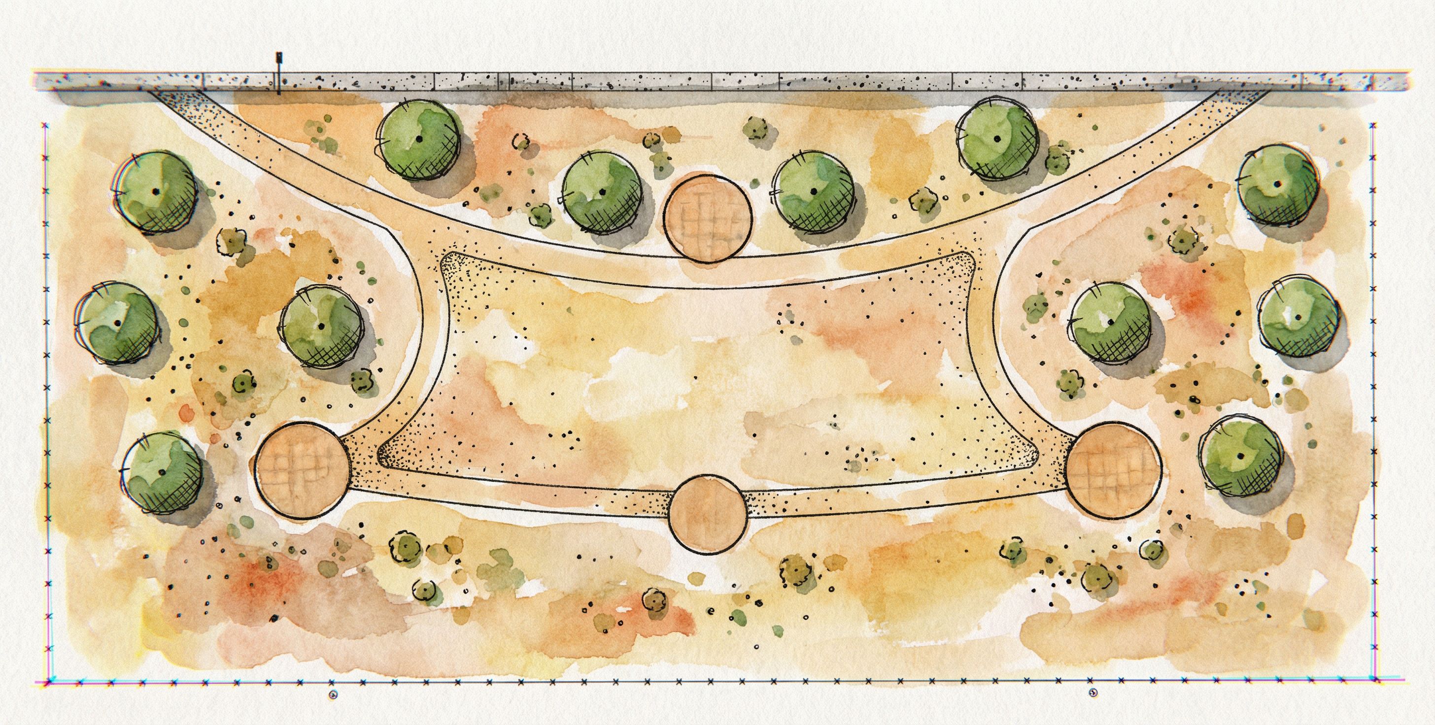 Take this CAD linework and create an accurate but hand drawn illustrative plan that renders the circles with dots as trees the bold circles as gathering spaces path as stabilized dg. this should have a xeric landscape feel that keeps budget minimal for shrubs and but in a loose generic watercolor style renders the open space as a desert colored dg.