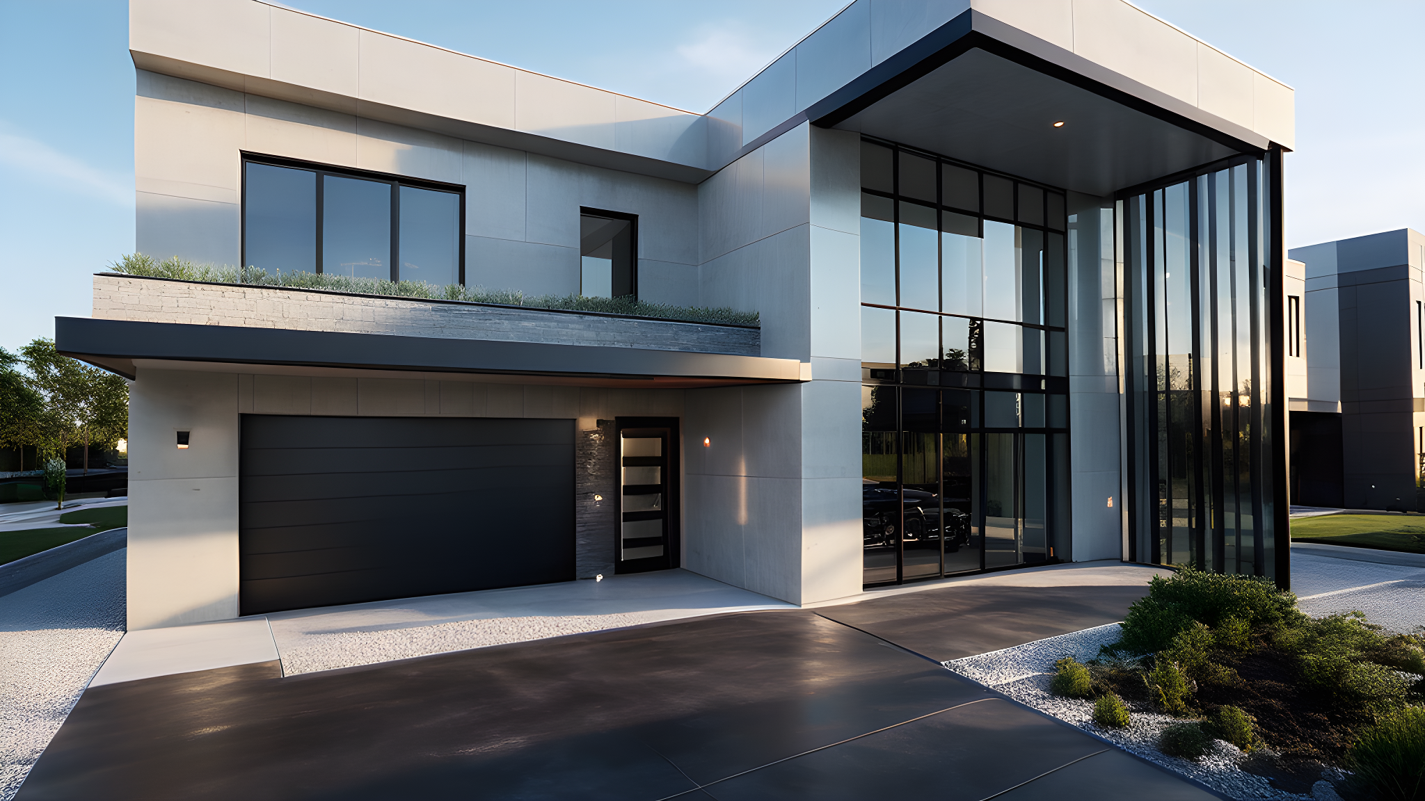PromptMODERN ARCHITECTURE, LAND SCAPE, GLASS, BLACK FACADE MATERIAL, CONCRETE DRIVE WAY, GARAGE DOOR, CARS ON DRIVE WAY, DAYLIGHT