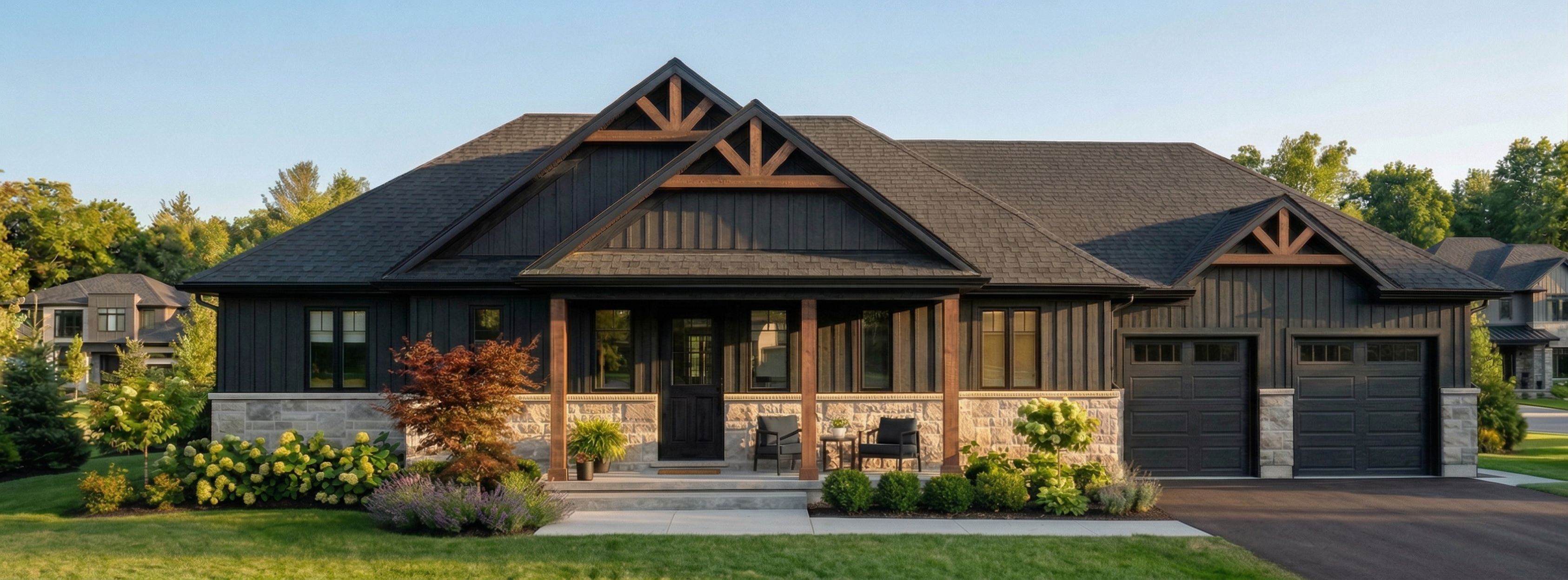 only show the gable brackets and posts as wood, the rest should be black to match the siding , keep exact camera angle