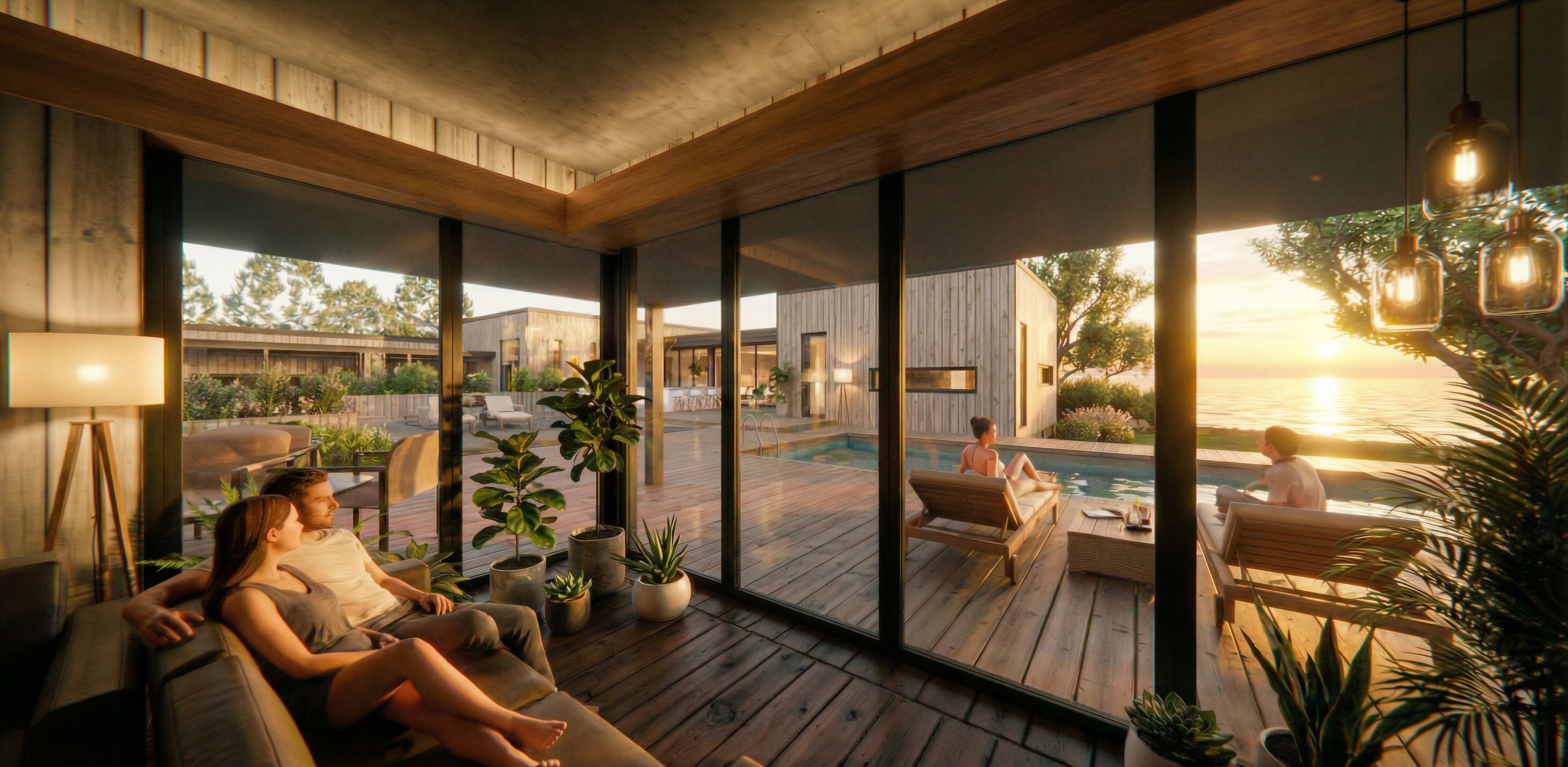 Make realistic, keep architecture. Make nice. Put plants in but not i front of windows keep architecture right view is ocean view through windows remove plants on left sde in front of windows.