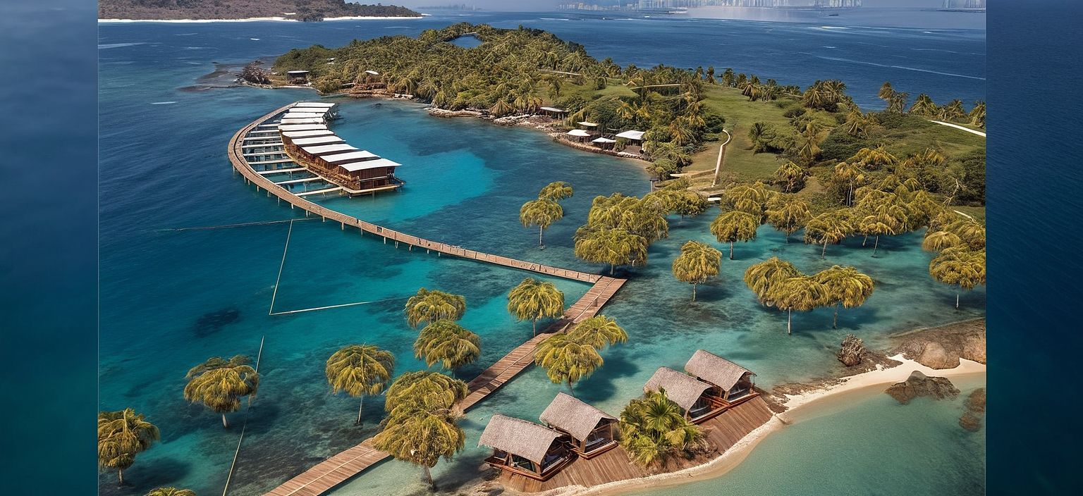 PromptPhoto of a modern tropical waterfront development on the coast of Kenya, featuring a series of minimalist cabins lined along a wooden pier extending over turquoise ocean waters. Emphasize clean lines, angular geometry, and natural wood materials complemented by palm-thatched accents. Surround the scene with lush tropical vegetation, swaying coconut palms, and vibrant coastal flora. Capture the bright, diffused midday sunlight typical of the equatorial coast, with shimmering reflections dancing on the water’s surface. Use a wide-angle perspective to showcase the arrangement of cabins, the graceful curvature of the pier, and the expansive ocean horizon, ensuring depth and dimension in the composition, the green space is golf course