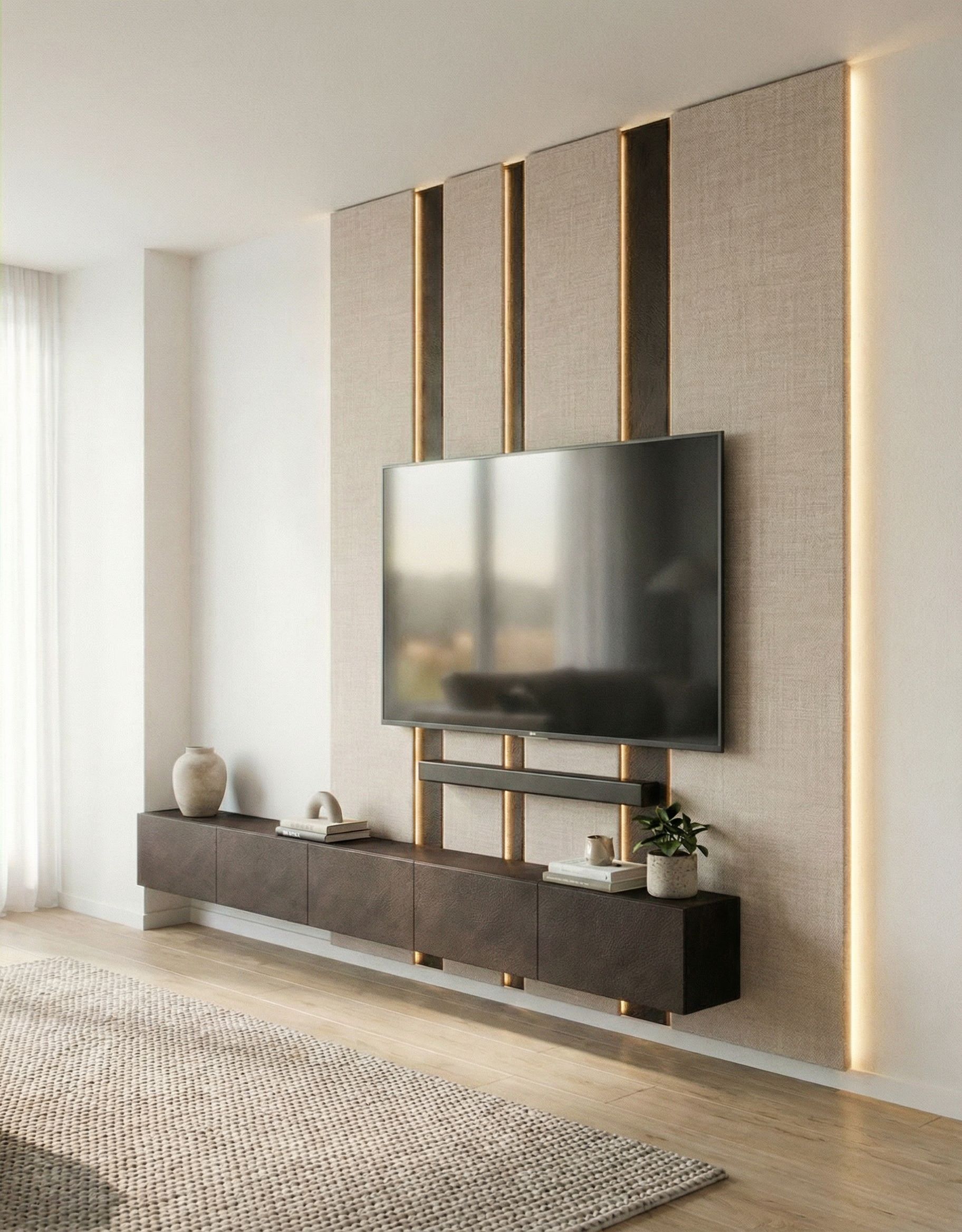 PromptPlace the dark wall panels slightly behind the beige ones to create a 3d effect and place secret light behind the left and right sides of the wall unit. Keep the rest of the wall white., keep exact camera angle