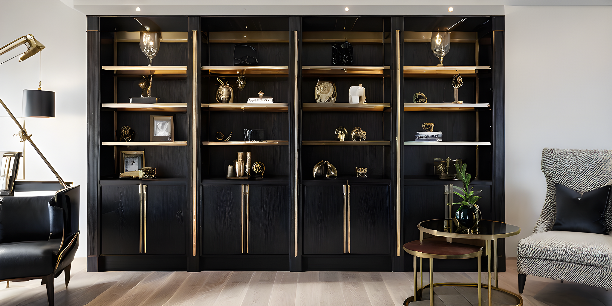 livingroom with cabinet in black oak and brass details and white walls