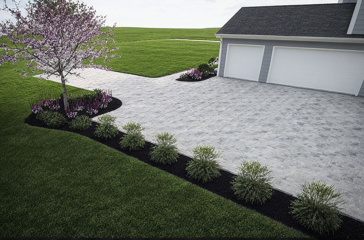 light gray house, white trim, lawn, black mulch, redbud tree, boxwoods