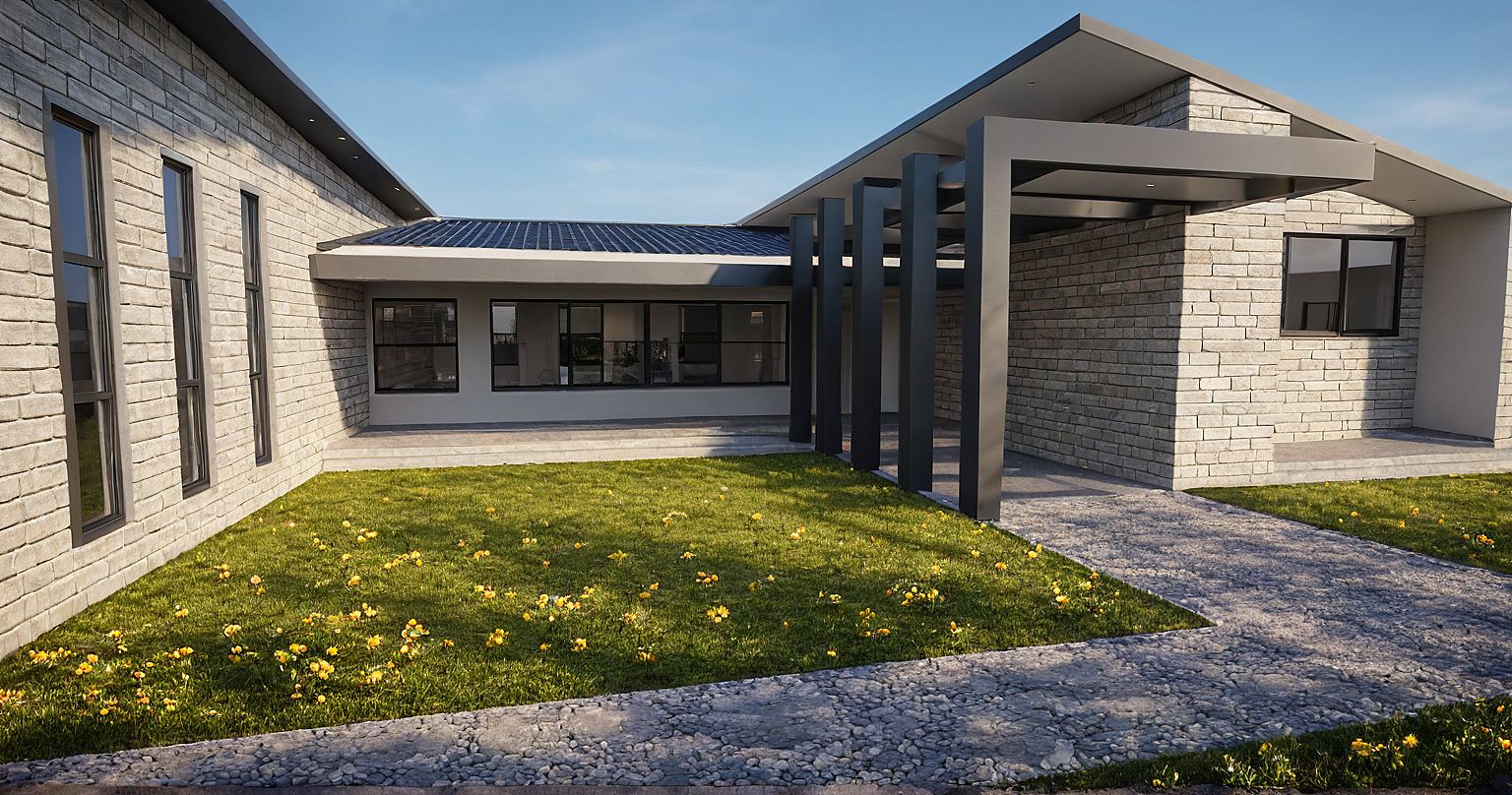 Modern House with a accentuated entrance of steel pergolas. Walls are smooth plastered and painted with some parts clad in stone. It has double carport and drive way, sleek windows, simple roof, and flowers and walkway. The pergolas have 600mm high footings in stone cladding at the base.