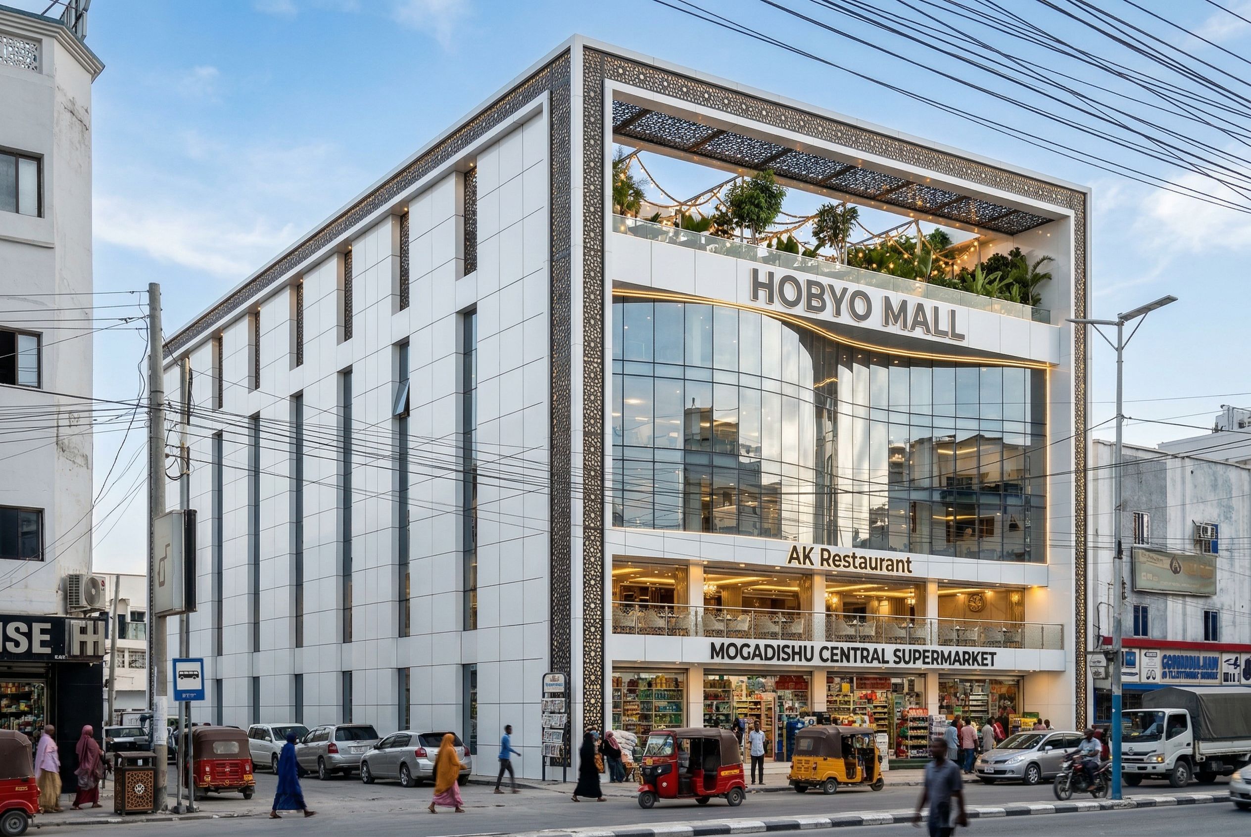 Commercial mall in Mogadishu Somalia. Make the glass realistic, transparent and reflective. Ground floor Supermarket and shops. First floor Restaurant with a balcony overlooking the road. Use white aluminium composite panels on the building . PUT PEOPLE OF SOMALI ORIGIN ON THE STREET. INCLUDE SOME SPOT LIGHTS, ROPE LIGHT AND STREET LIGHTS ON THE BUILDING. MAKE IMAGE HIGH RESOLUTION 8K. PUT NAME "HOBYO MALL" ON THE BUILDING. MAKE THE CURTAIN WALLING URVED AS IN THE ORIGINAL DESIGN AND INCLUDE RESTAURANT ON FIRST FLOOR WITH A GLASS BALCONY OVERLOOKING THE ROAD. MAINTAIN ORIGINAL DESIGN WITH THE CURVED CURTAIN WALLING ON THE FACADE. NAME RESTAURANT ON FIRST FLOOR "AK Restaurant" and make curtain walling fom a regular curve as in the original design. Put Arabic mashryabiya all round the main structure framing the buildling and on the top open part on the facade. Add a rooftop restaurant overlooking the road with some interior gardening. PUT THE BUILDING IN CONTEXT TO REPLACE THE GREEN BUILDING IN THE REFERENCE IMAGE., keep exact camera angle