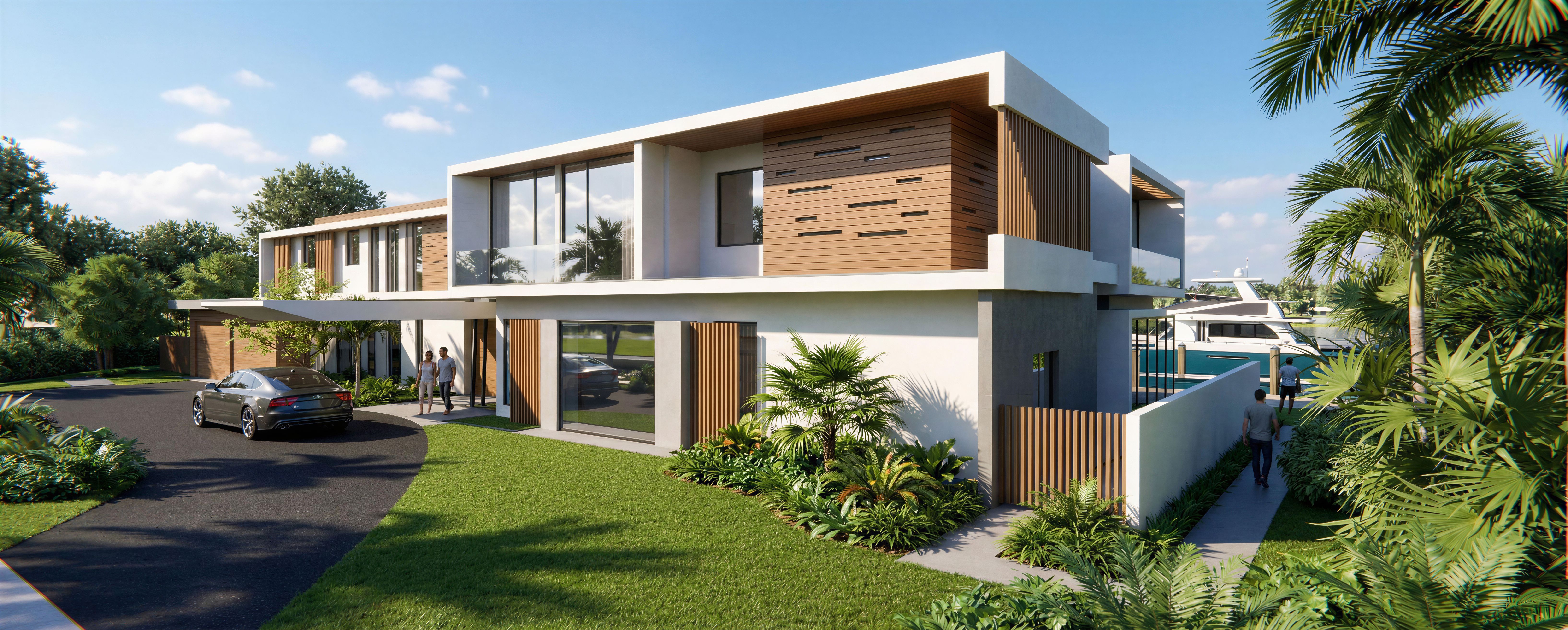 EnhancedPromptHIPER RELISTIC RENDER. MODERN HOUSE. CLEAR SKY WITH SOME CLOUDS. ADD SOME VEGETATION TIPICAL FORM FLORIDA. ADD SOME HIGH DEFINITION PEOPLE WAKING AROUND. REPLACE DE VEHICLE FOR AN AUDI S7 IN THE SAME POSITION. KEEP THE POINT OF VIEW EXACT AS IT IS., keep exact camera angle
