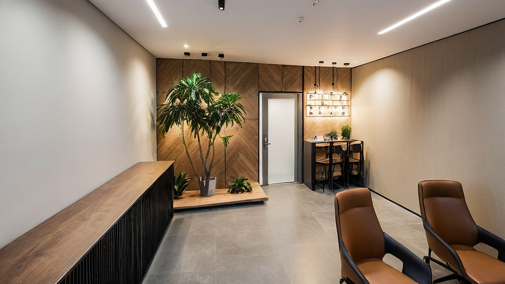 Design an office for me in a modern style, add lighting for me.