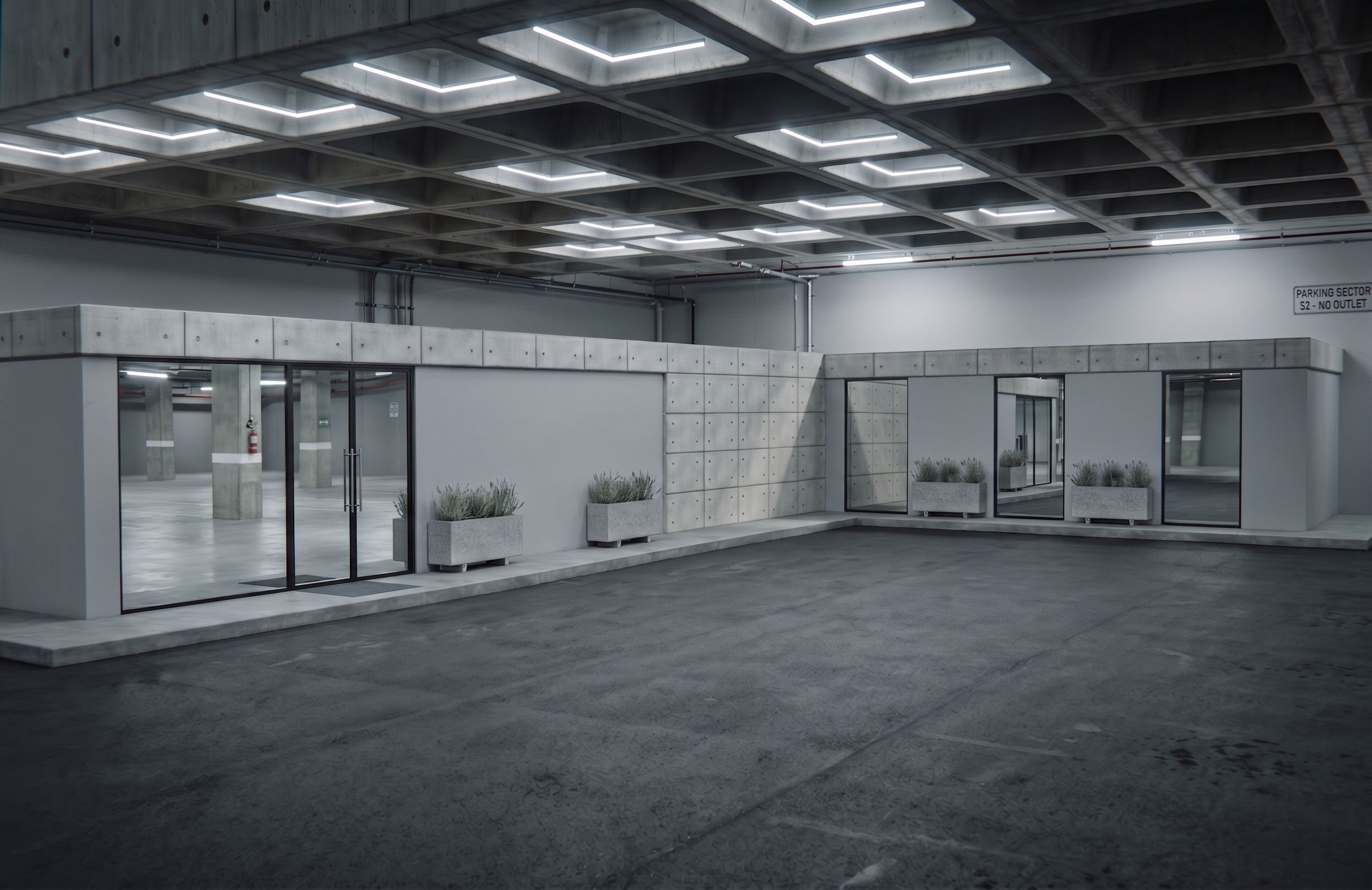 Promptno coloques la division de los puestos de estacionamiento ni reflejes coches en los cristales, y las paredes colocalas color gris , keep exact camera angle