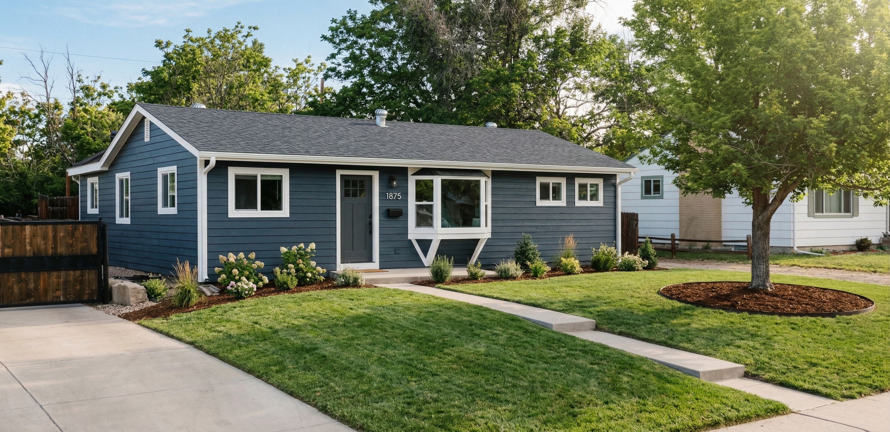 PromptShow me what this house could look like with a nice new paint job, new roof, painted trim, fixed concrete, and landcaping. remove the car. also put landcaping mulch ring around the tree, keep exact camera angle