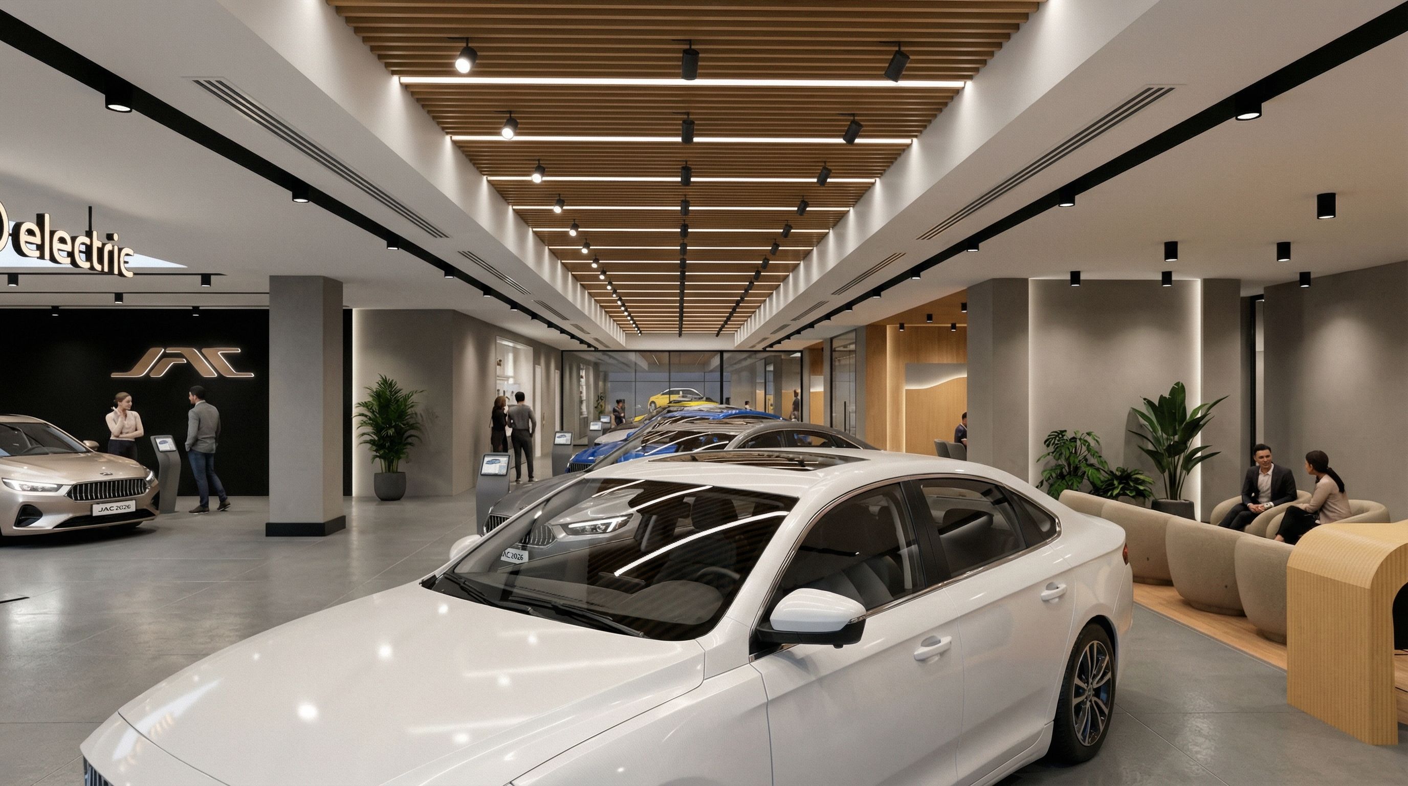 Ultra-photorealistic interior render of a modern JAC electric car showroom, strictly maintaining the exact same camera angle, lens position, composition, proportions, depth, and object placement as the reference image. Do NOT crop, rotate, zoom, or alter the perspective in any way. 🏢 Overall Concept A contemporary, high-end automotive showroom with a refined modern-industrial character. The space combines velvet-painted walls, concrete-effect flooring, warm wood-toned aluminum ceiling baffles, and a sophisticated multi-layer lighting system, creating a premium, calm, and future-forward environment that highlights JAC electric vehicles. 🟦 Ceiling Design Ceiling composed of linear aluminum baffles finished in a warm wood-tone color, running longitudinally along the showroom axis. On both sides of the baffles, gypsum mirror ceilings finished in smooth matte off-white. Linear air-conditioning grilles seamlessly integrated into the gypsum mirror ceilings on both sides of the baffles, minimal and visually clean. Ceiling layout, dimensions, and alignment remain exactly as in the reference image. 💡 Lighting Concept Multi-Type Lighting System A layered architectural lighting strategy using three distinct lighting types, all fixed in their original positions: Recessed Groove Spotlights Black recessed ceiling grooves running linearly. Integrated black cylindrical spotlights inside the grooves. Used for focused accent lighting on vehicles and circulation paths. Linear Lighting Between Baffles Slim linear LED fixtures installed between the aluminum baffles. Provide soft, continuous ambient illumination along the main axis of the space. Light output is even and diffused, with no visible LED dots. Track Lighting with Spotlights Between Baffles Black track lighting installed between selected baffle lines. Adjustable black spotlight heads mounted on the tracks. Used to highlight specific vehicles and display zones. All lighting uses a neutral white color temperature ~4000K. Balanced contrast with no glare, hotspots, or harsh shadows. Lighting enhances vehicle surfaces, reflections, and spatial depth. 🧱 Walls & Vertical Elements Walls finished with luxury velvet-effect paint, soft matte texture. Neutral warm-grey tone. Feature wall with black panel and illuminated JAC logo. Select areas with warm natural wood finishes. Branding remains minimal and architecturally integrated. 🧱 Columns Structural columns finished in smooth grey velvet-effect paint. Black metal base skirting at column bases. Columns remain fixed in their exact original locations. 🪨 Flooring Large-format concrete-effect porcelain tiles, matte finish. Neutral grey tone. Black skirting وزر أسود along walls and column bases. Subtle, realistic floor reflections. 🚗 Vehicle Display & Arrangement Multiple JAC 2026 electric vehicle models in fixed positions. Vehicles finished in modern contemporary colors: Pearl white Metallic silver Graphite grey Electric blue Champagne / light bronze Exact alignment, spacing, scale, and orientation preserved. 🪟 Additional Elements Glass partitions with black metal frames. Minimal digital information stands beside vehicles. Lounge seating area unchanged. Suspended branding signage such as “pure electric”, clean and legible. 📸 Photography & Post-Processing Effects Subtle ISO noise for natural sensor realism. Fine film grain for cinematic architectural photography. Professional tone mapping preserving highlight and shadow detail. Mild exposure correction and contrast balancing. Soft sharpening pass without over-processing. Controlled, minimal bloom on light sources. No HDR exaggeration or artistic filters. 📷 Camera Metadata Realistic Architectural Photography Camera type: Full-frame DSLR / Mirrorless Focal length: 24–28mm Aperture: f/8 – f/11 deep focus, architectural clarity ISO: 200 – 320 clean image with subtle noise White balance: Neutral / 4000K Shutter speed: Adjusted for correct exposure tripod-mounted camera 📸 Camera & Rendering Rules CRITICAL Exact same camera angle, height, lens, and framing. No movement, replacement, resizing, or rotation of any object. No changes to ceiling layout, lighting positions, furniture, vehicles, walls, or columns. Ultra-photorealistic architectural visualization quality comparable to a professional showroom photoshoot., keep exact camera angle