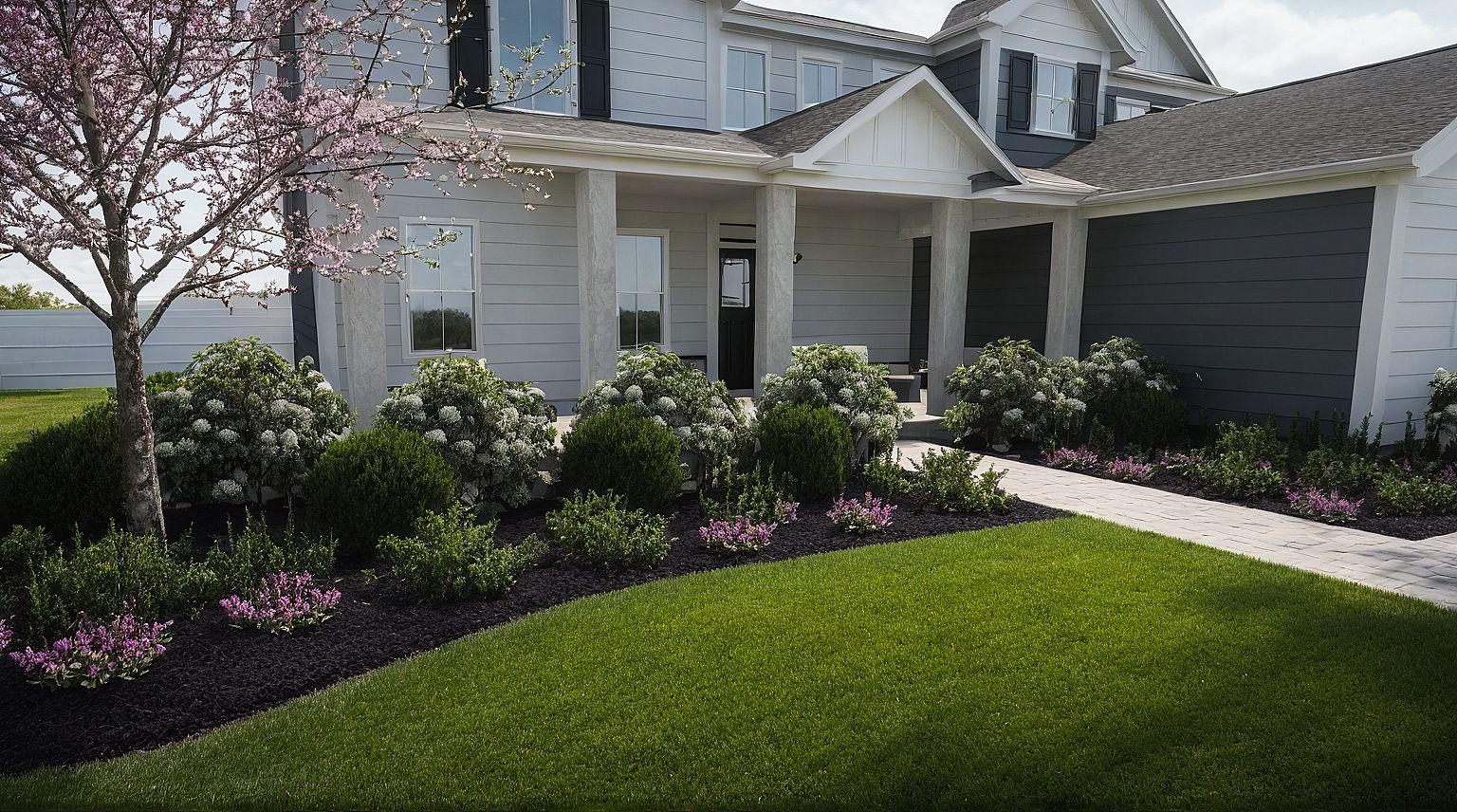 light gray house, white trim, lawn, black mulch, redbud tree, boxwoods