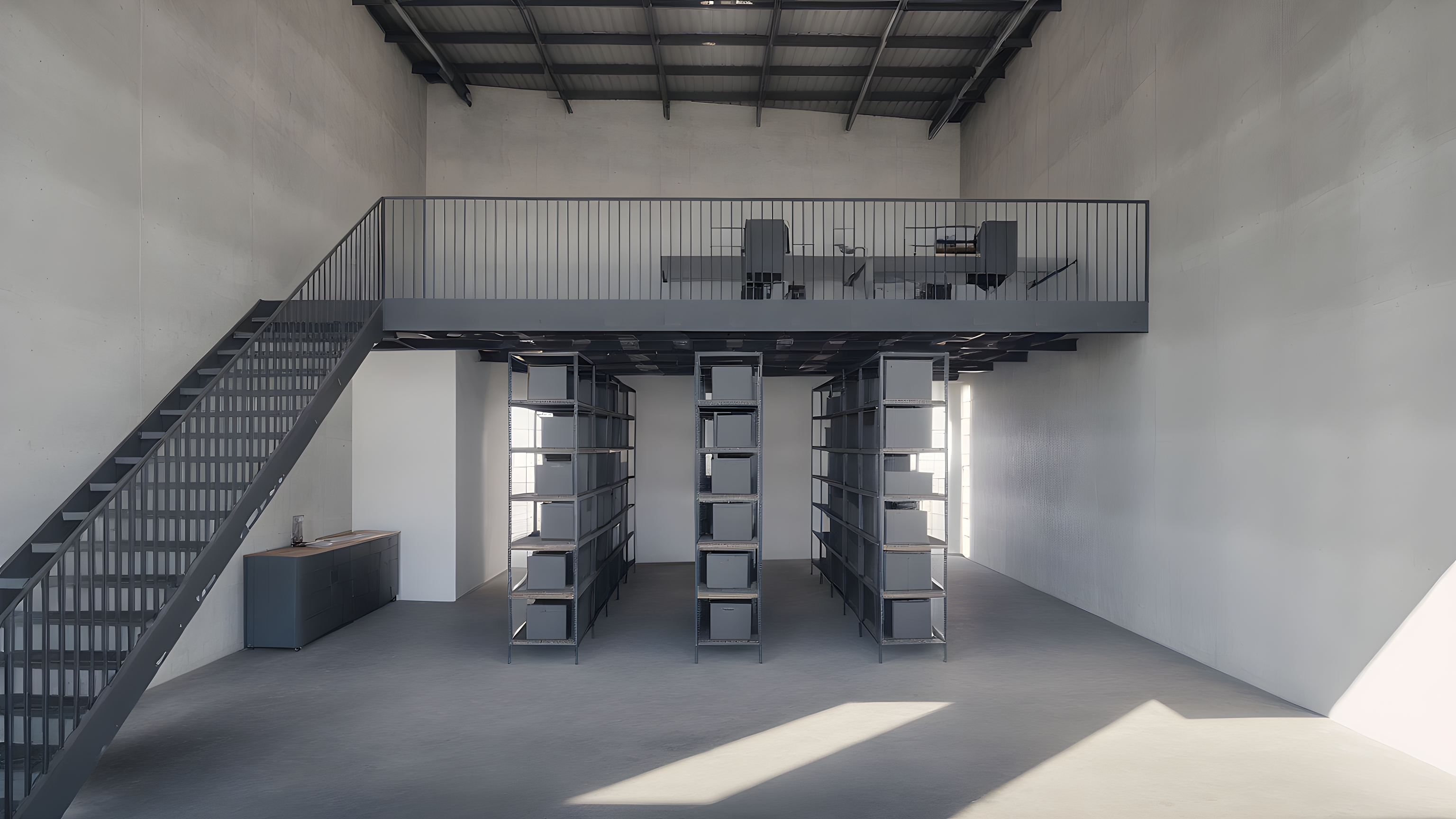 PromptModern, simple, and natural light filled storage warehouse with office above. there are no windows, grey walls are smooth grey, white walls are white