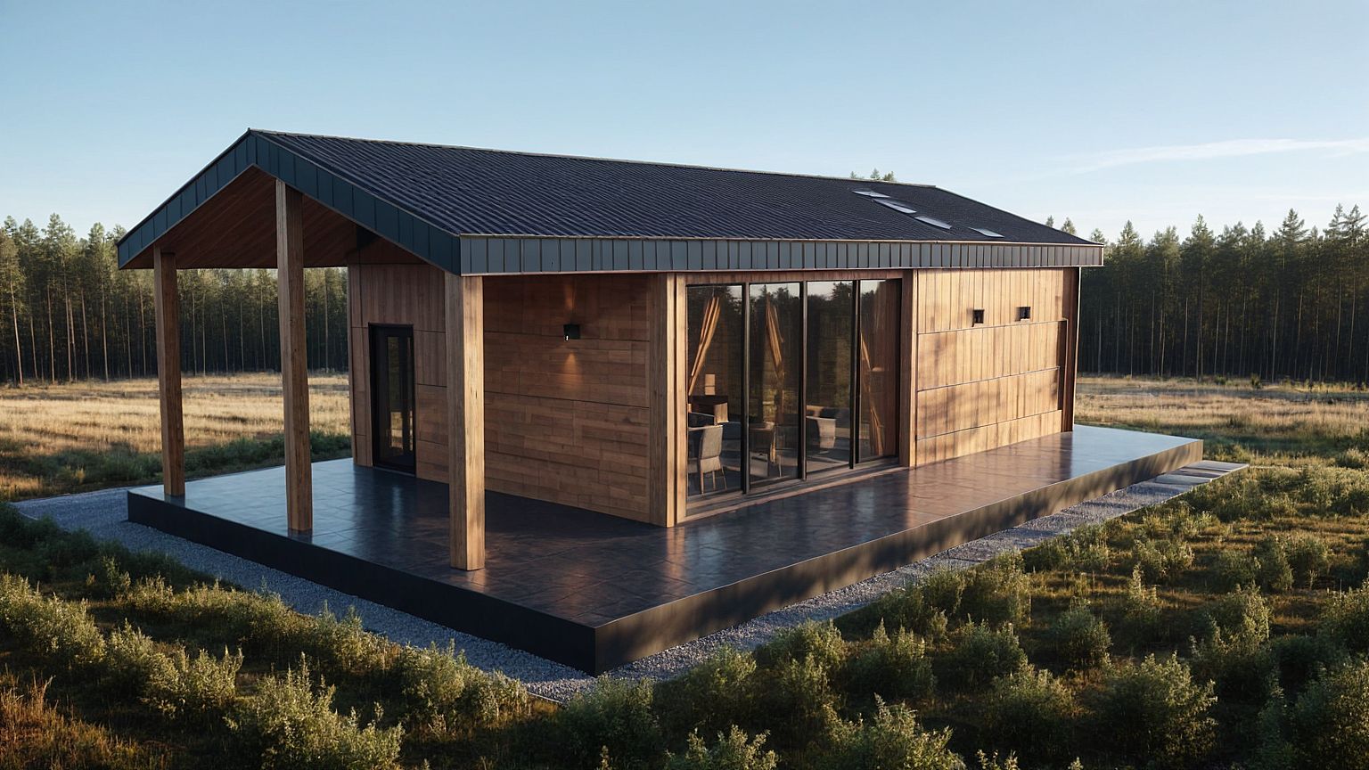 PromptA modern barnhouse surrounded by a forest, with wooden panels, glass windows, straight lines, geometric shapes, iron sheets and wooden planks.
