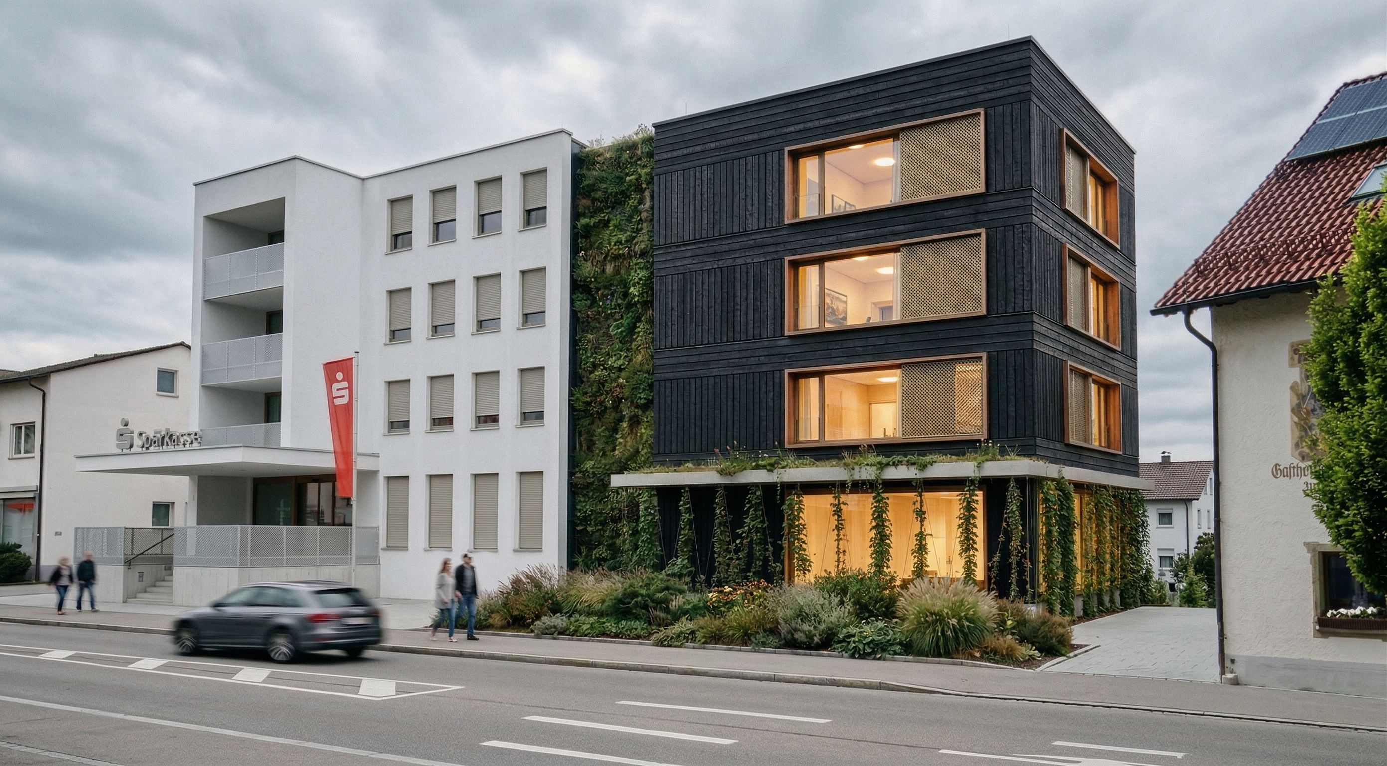 Erstelle eine hochwertige Architekturvisualisierung. Behalte dabei unbedingt die Geometrie und Perspektive aus dem importierten Bild bei. Lasse in dem Gebäude mit schwarzer Fassade noch innen die Lichter warm leuchten. Passe den Baum rechts im Bild farblich an die Stimmung Sonnenschein auf dem Baum weg an. , keep exact camera angle