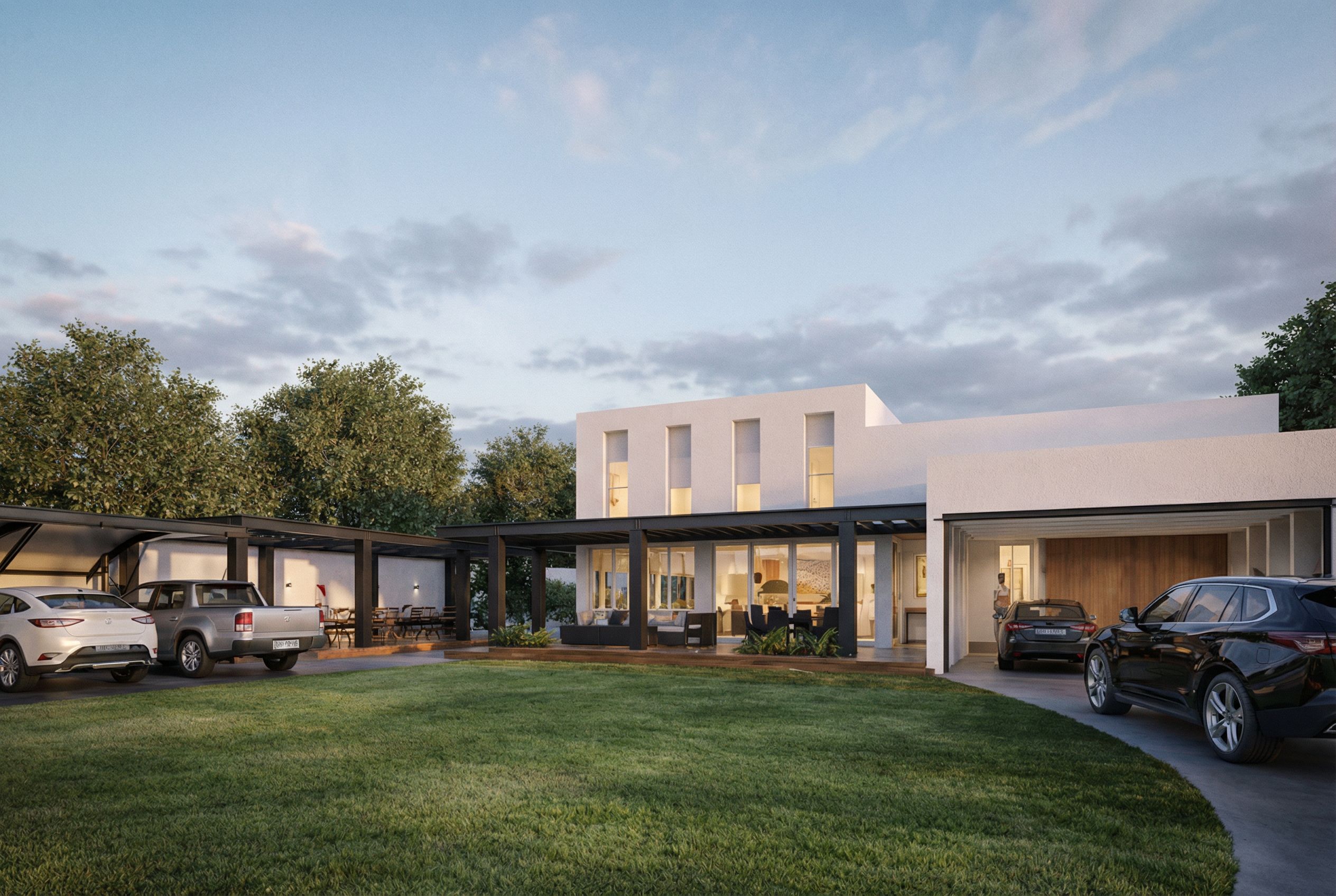 Photo of a modern residential house situated in a lush green landscape, characterized by a flat roof, large glass windows, and minimalistic white and wooden textures. Framed by trees and a well-manicured lawn, the structure features an open carport and a covered patio for outdoor living. The scene is illuminated by soft afternoon sunlight, casting gentle shadows on the grass. A low-angle perspective captures the front facade, highlighting architectural details and inviting surroundings. Use a wide-angle lens for an expansive view, bringing depth to the composition., keep exact camera angle