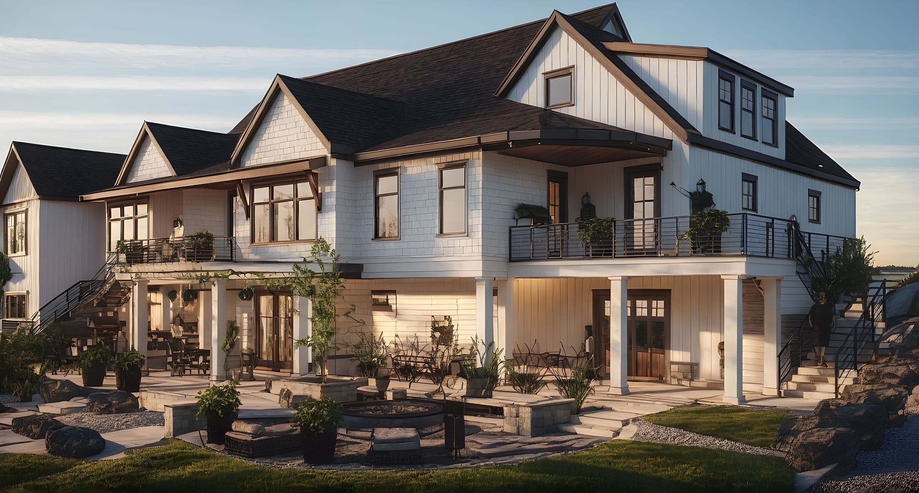 PromptCottage style white LAKE home with sun setting and bright lighting in windows.