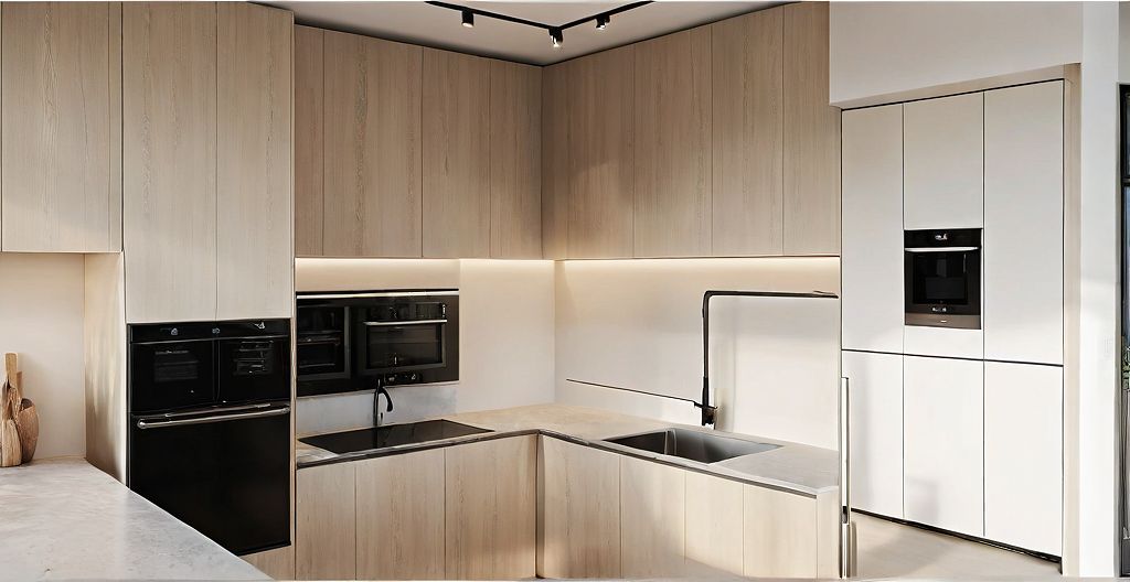 PromptUltra-realistic render of a modern minimalist kitchen strictly following the provided 3D model layout. On the left side, a tall oven tower with integrated double ovens in matte black and stainless steel finish. On the right side, a sleek refrigerator with a metallic surface and clean vertical handles. The kitchen features seamless white cabinetry with hidden handles, a central island with a light gray stone countertop, and under-cabinet LED lighting creating soft ambient glow. Large floor-to-ceiling windows allow natural daylight to fill the space, reflecting softly on polished ceramic flooring. Neutral palette with whites, grays, and subtle wood accents. Photorealistic materials, cinematic lighting, wide-angle interior photography, 8K hyperrealism, sharp details and soft shadows, elegant minimalism.