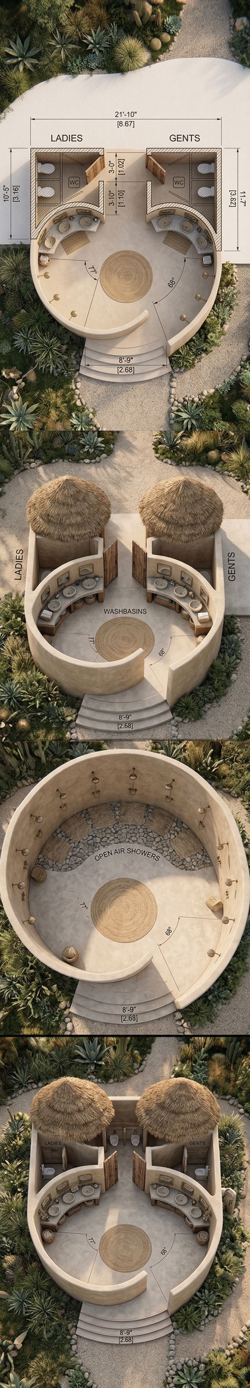 Promptthe attached image shows the floor plan i want exactly , the showers are open to air and to be situated on the curved south walls. the roof over the toilets should be thatched and possible a heap style , keep exact camera angle