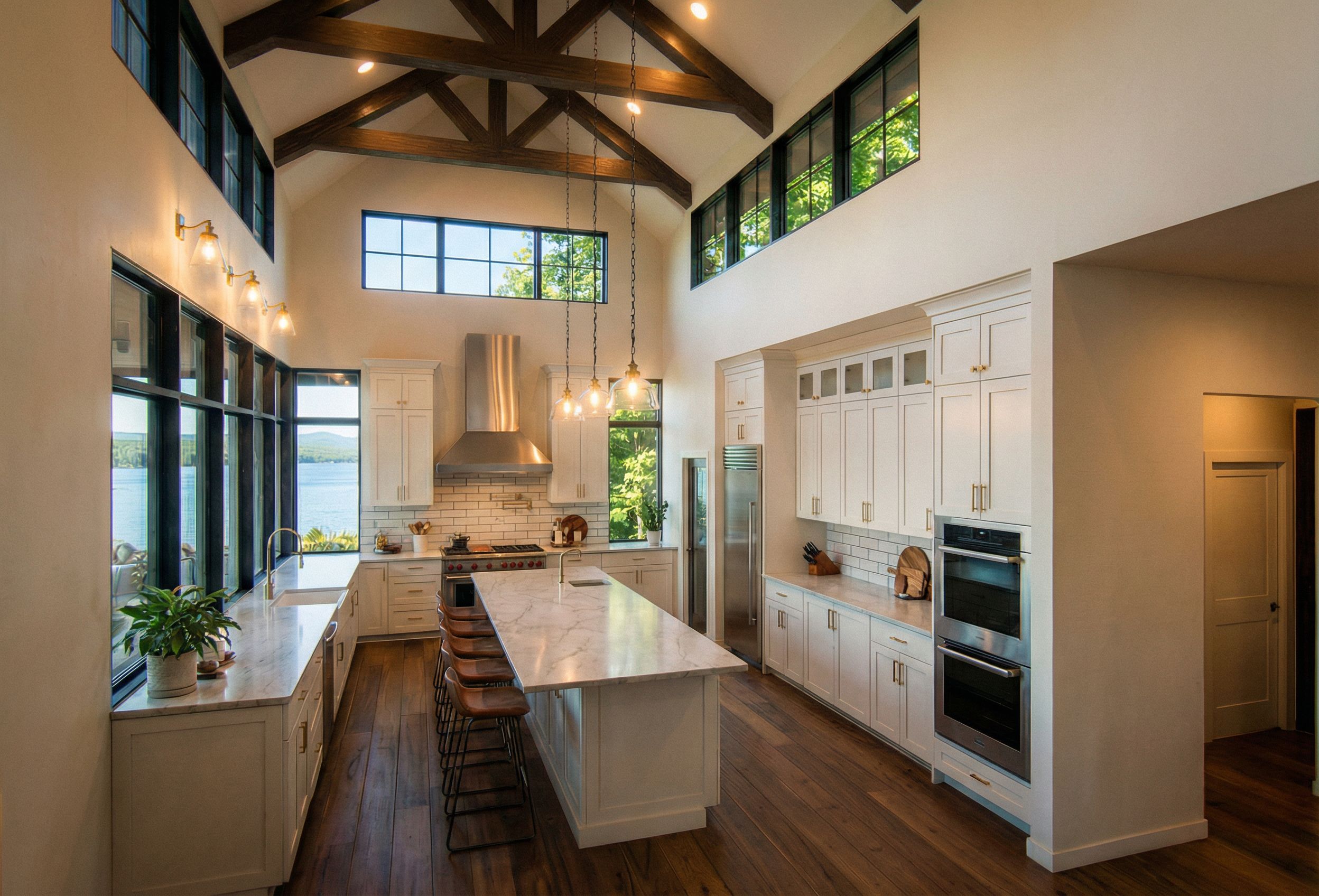 PromptMake photorealistic rendering of farmhouse kitchen per Uploaded Image, stainless steel appliances, white wood cabinets, white tile backsplash, brass hardware, black window frame, lake view per Reference Image 1 from the windows on the left, trees view from the middle and right windows, floor and trusses material from Reference Image 2, keep exact camera angle
