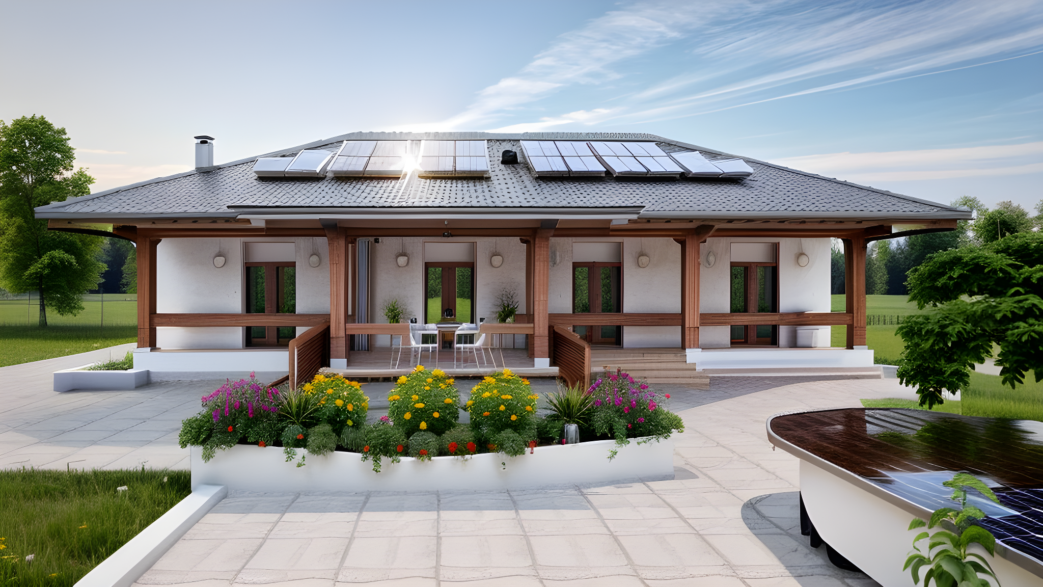 PromptSmall house in Romania, white plaster walls and wood, solar panel on roof, modern, with porch