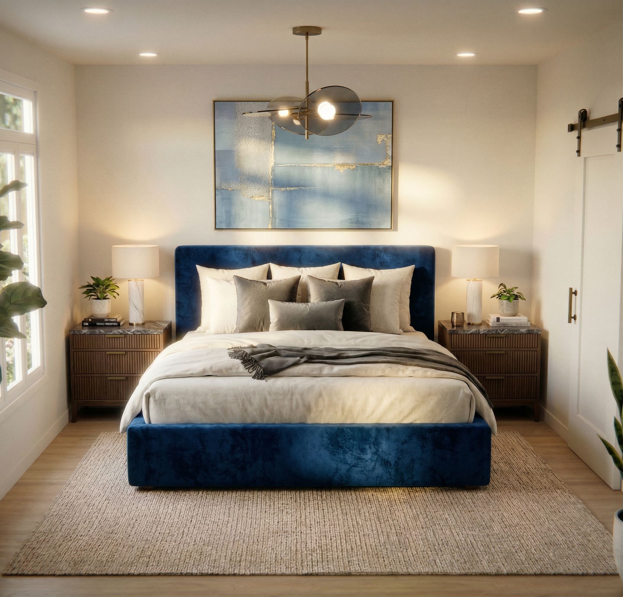 blue bed, change wall art, keep exact camera angle