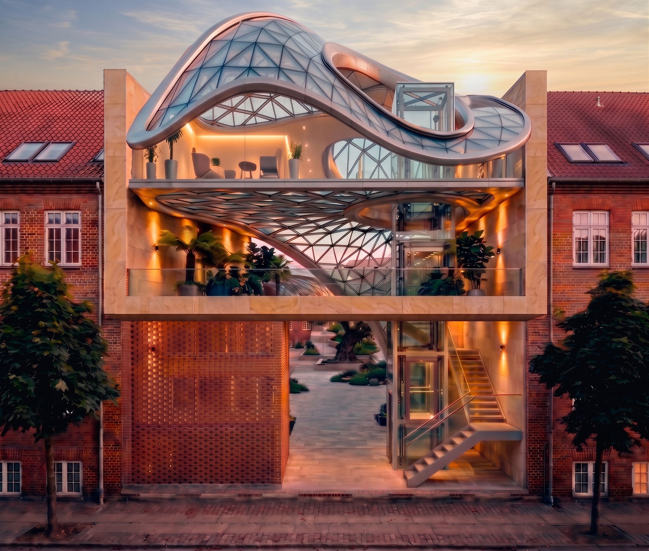 PromptEdit this image and make the details much sharper and more defined. Replace the square elevator with a more defined glass elevator. Replace the plants with plants with fewer leaves and more defined, high-resolution leaves. Improve the quality of the materials, both the red bricks and the sand-effect cladding slabs. Improve the connection technology for the glass and iron structures. Improve the lighting and make it more realistic; improve the sky. Eliminate graphical errors. Tone down the colors., keep exact camera angle