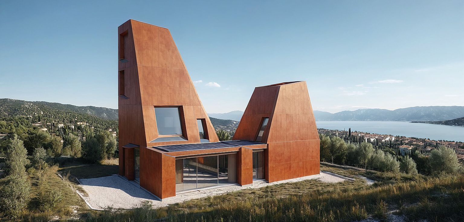 Promptbuilding structure is x-lam panel with load bearing wall exterior facade is covered with cor-ten alluminium that has bronze orange brown color , One big tower and one small tower. Two towers all have windows which all are bow windows with simple design, on the first floor there is living room with big window. There is terrace on the second floor between two towers . top of the tower have a skylight window with solar panel . Building is located in Verona Malcesine, on the little hill in the middle of the trees and grasses