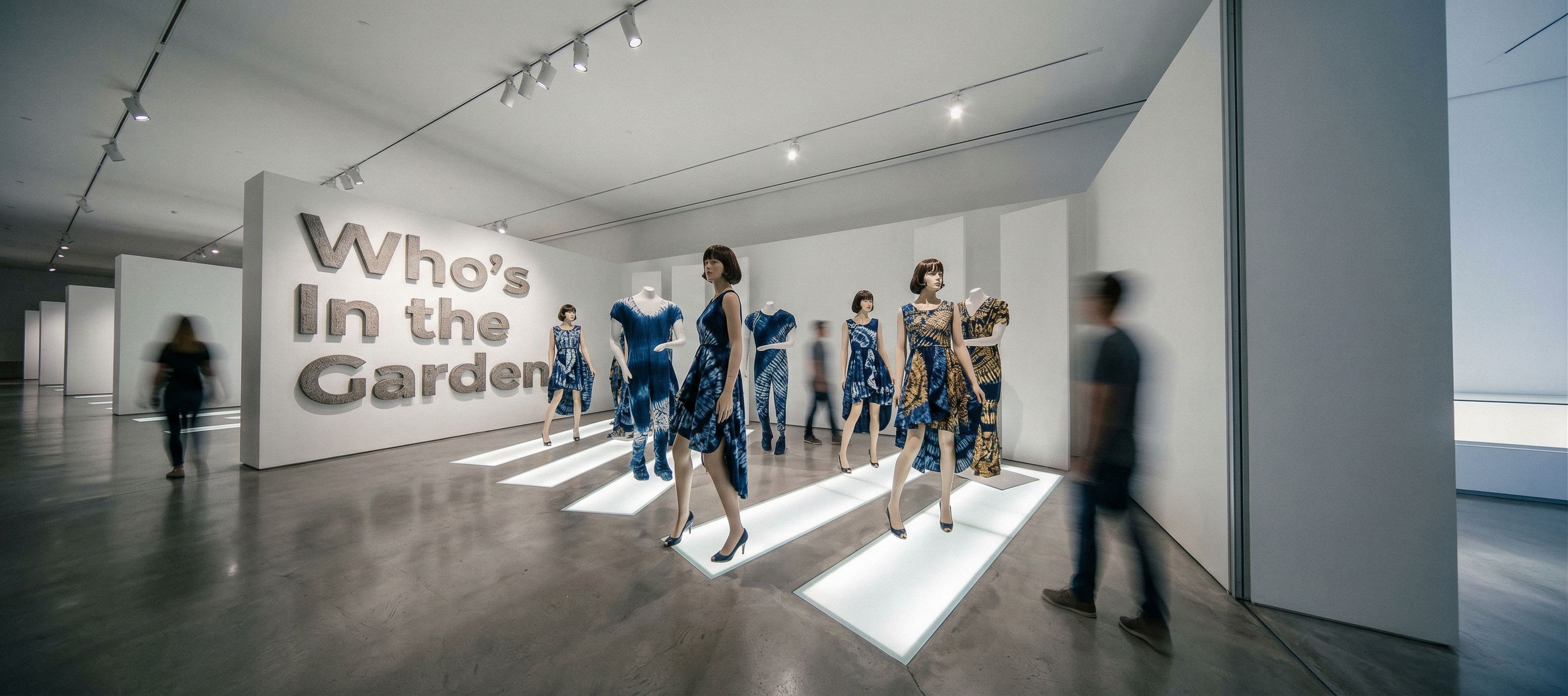 Photo of a minimalist exhibition and mannequin garden space featuring abstract sculptures and mannequins. Emphasize sleek lines, smooth textures, and the interplay of light and shadow on stark white walls. The vast room creates an open atmosphere, surrounded by spot and track lighting Capture the view from a low angle, with a wide-angle lens to highlight the spatial dynamics and depth within the gallery, showcasing the contemporary art displayed. Adire and batik fabric on the models, mannequins, keep exact camera angle