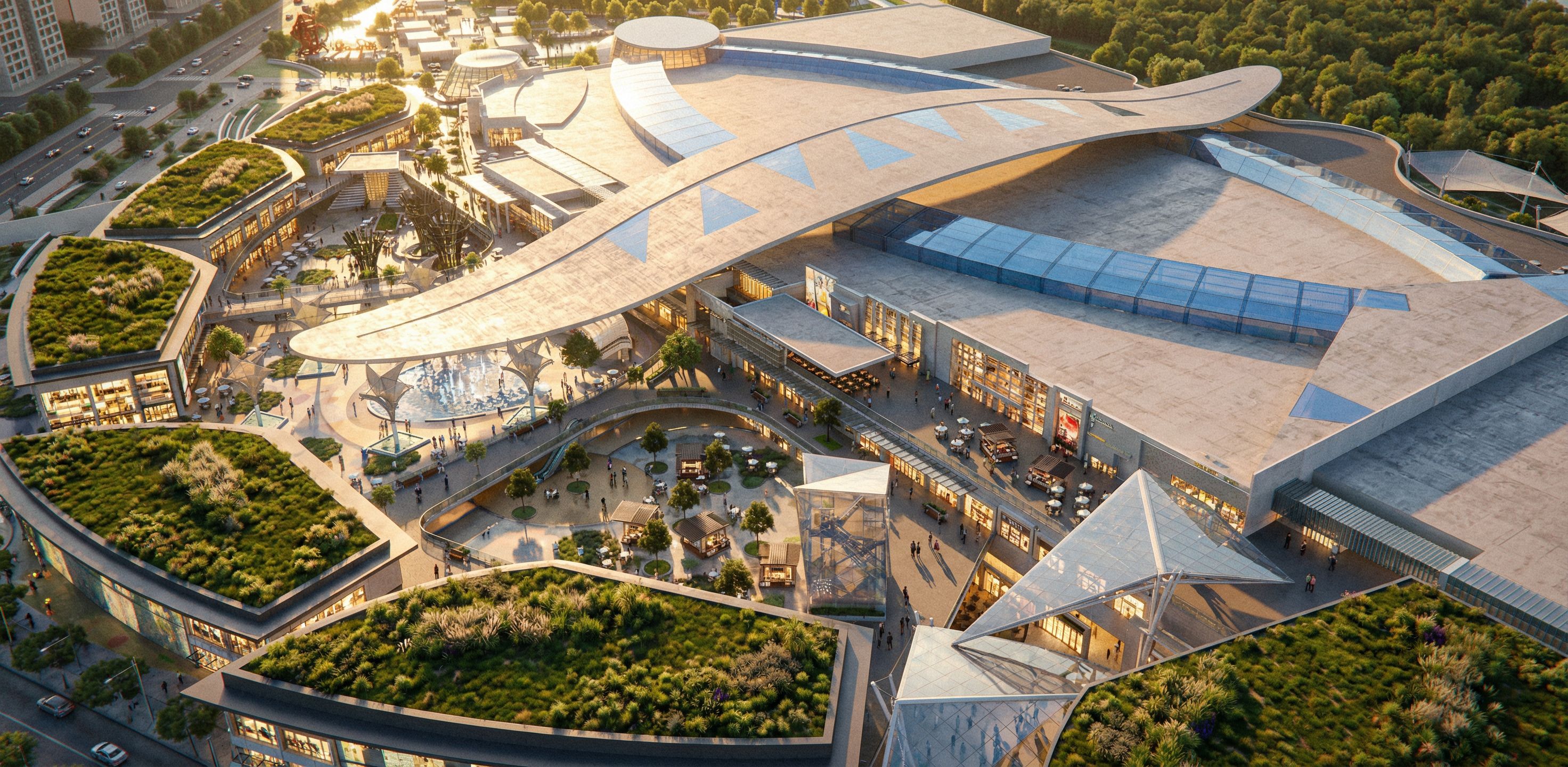 Photo of a modern commercial complex featuring an innovative architectural design with a sweeping roofline and extensive glass elements. Architectural details include textured concrete, green roofs, and dynamic structural shapes. Located in an urban environment, surrounded by greenery and various recreational spaces. Soft natural lighting highlights the contours of the buildings at midday. Aerial perspective captures the entire layout, emphasizing symmetry and flow, with a focus on an expansive outdoor area filled with trees and seating. Wide-angle lens to enhance depth and scale. Keep camera angle as is. Ultra realistic rendering., keep exact camera angle