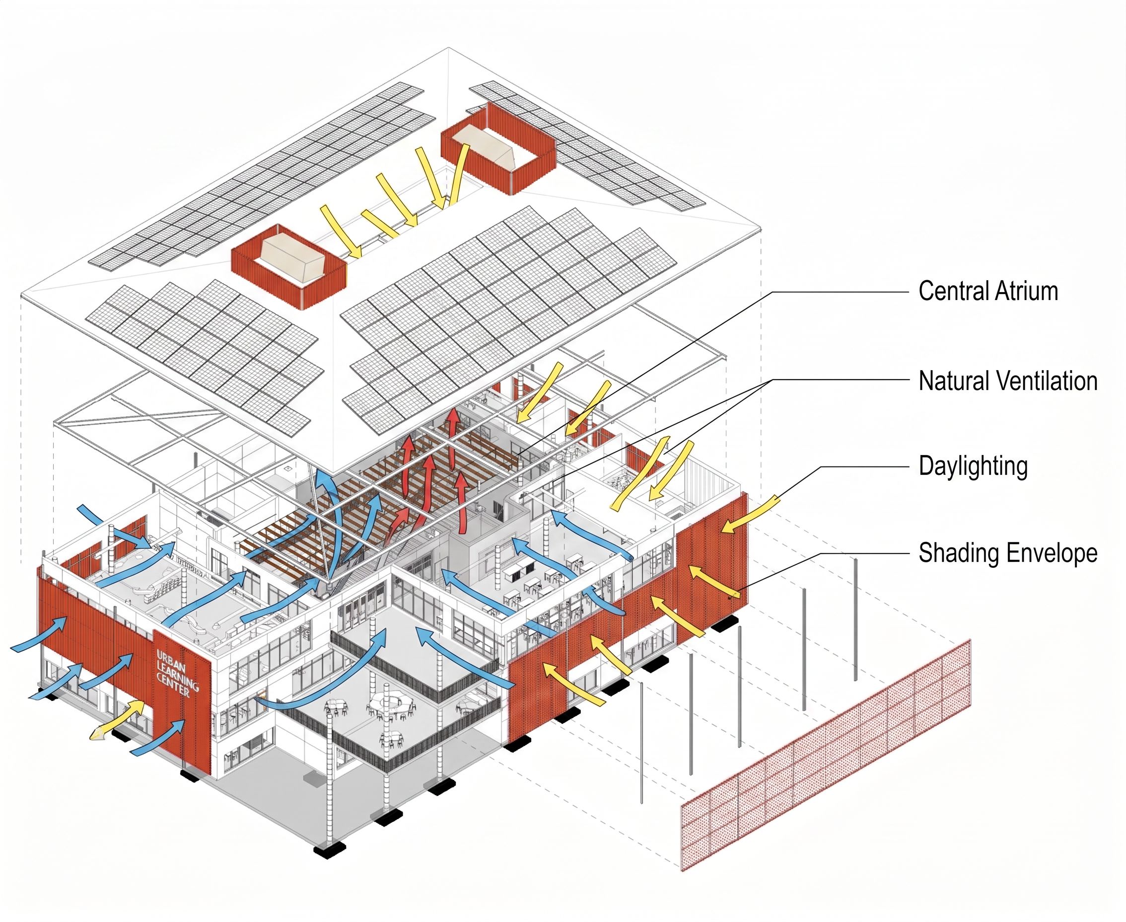PromptExploded axonometric diagram of a building showing passive environmental strategies. Keep original building massing simple and clean. Highlight: - central atrium (slightly darker tone) - airflow paths (blue arrows moving through building) - warm air rising (red arrows upward) - daylight penetration (yellow arrows from roof and facade) - facade shading layer (offset from main wall) Style: clean architectural diagram black linework with limited color overlays (yellow, blue, red) white background minimal shading Include labels: "Central Atrium" "Natural Ventilation" "Daylighting" "Shading Envelope" add solar panels and make the errows in the middle not the mechanichal unites , keep exact camera angle
