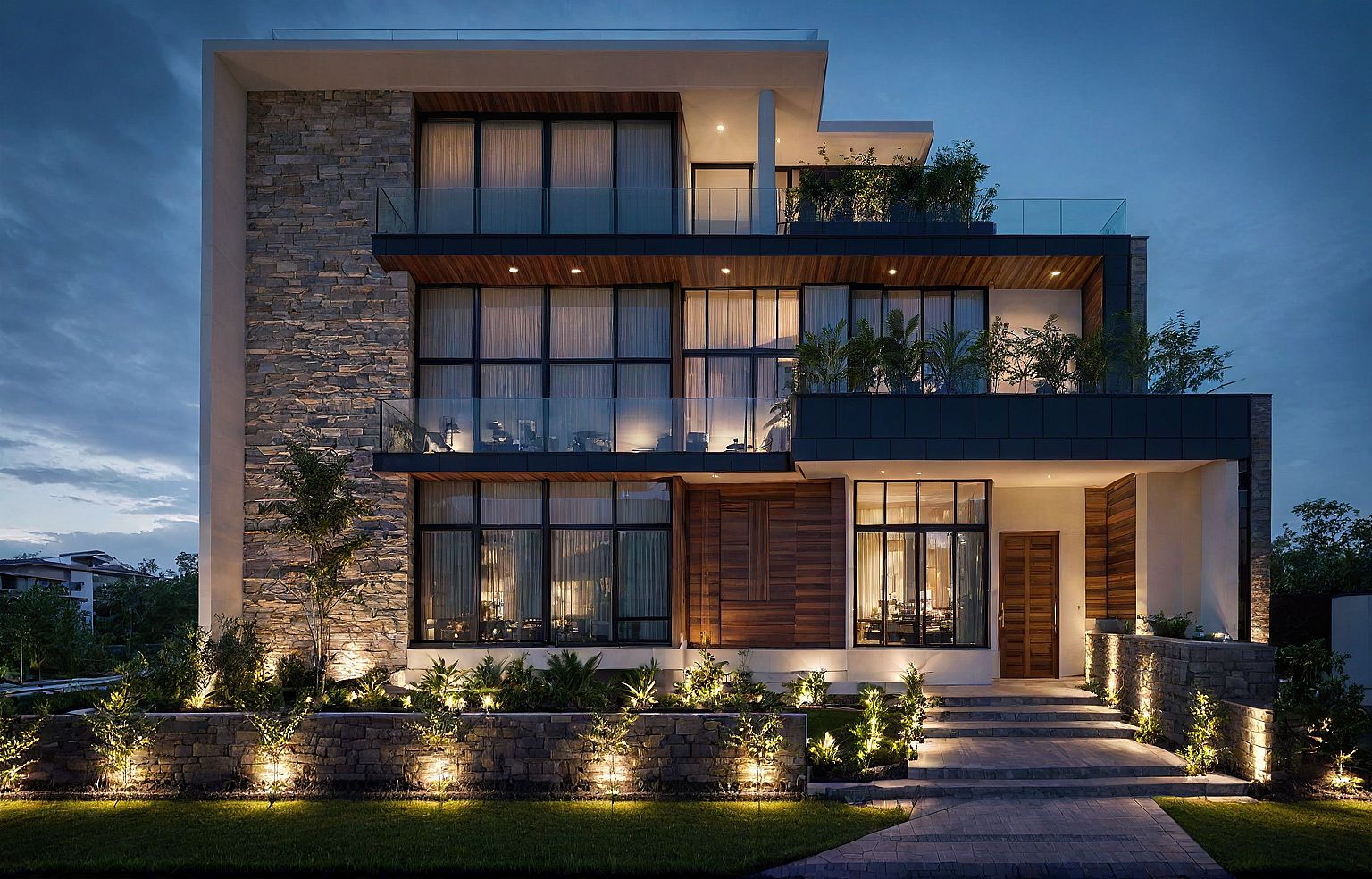 Photo of a modern residential building featuring sleek lines and multiple balconies. Emphasize the textured stone façade, large glass windows, and wooden accents that create a harmonious blend of materials. Surrounded by a landscaped garden with lush greenery, the structure stands against a night setting with artificial lighting illuminates the scene, casting gentle shadows that enhance the architectural details. Captured from a low-angle perspective to highlight the height and dynamic design, using a wide-angle lens for a broad view of the surroundings.