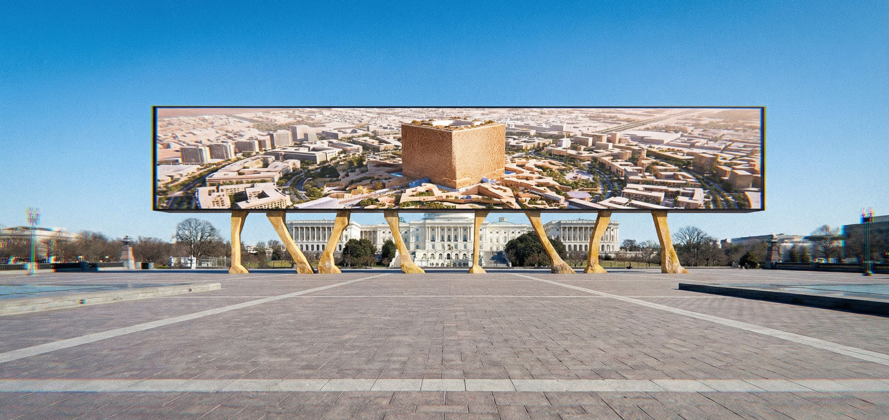Promptkeep exact camera angle , BLACK IS SCREEN , YELLOW IS Riyadh stone , Washington DC , PUT New Murabba PROJECT ON SCREEN,, keep exact camera angle