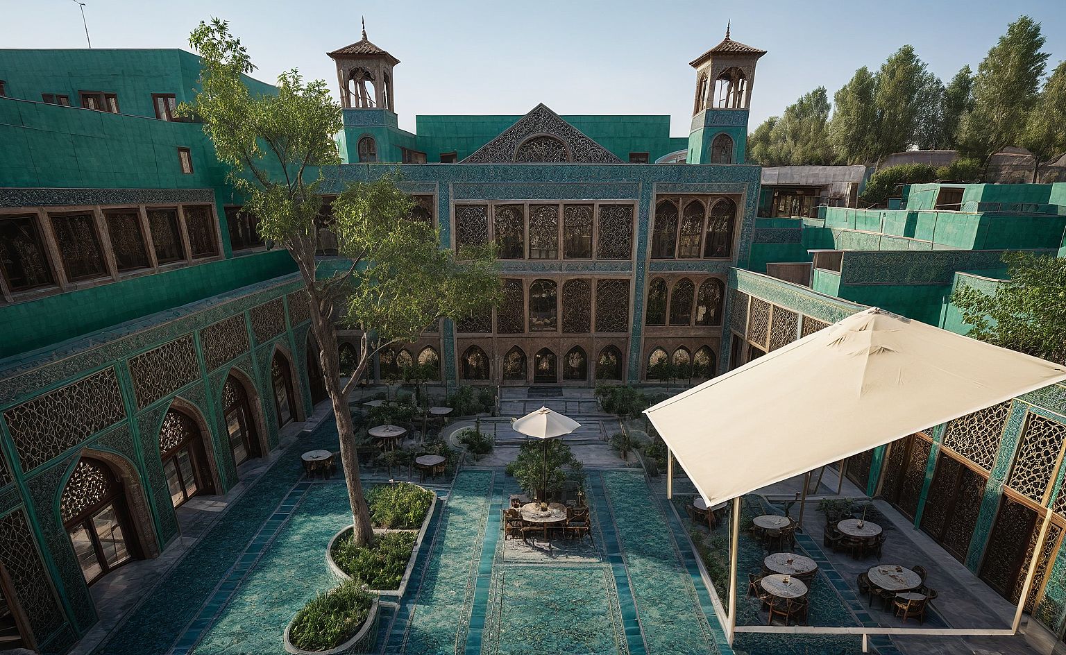Prompti want the exact picture just the extra room with same material in picture dont touch anything in this photo with traditional persian color and material green and blue ceramic