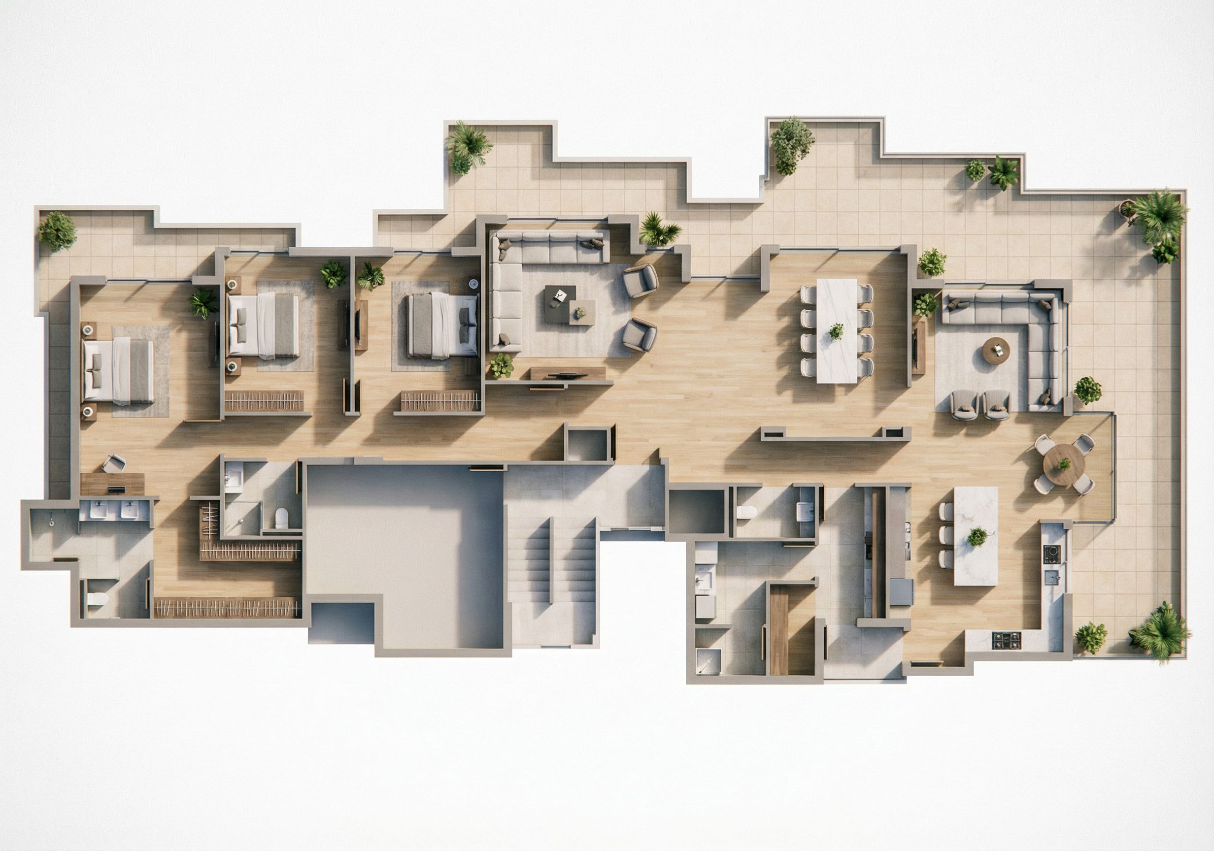Promptmodern interior, parquet flooring light color and no pattern, terrace with floor tiles all around, furniture and plants in terrace