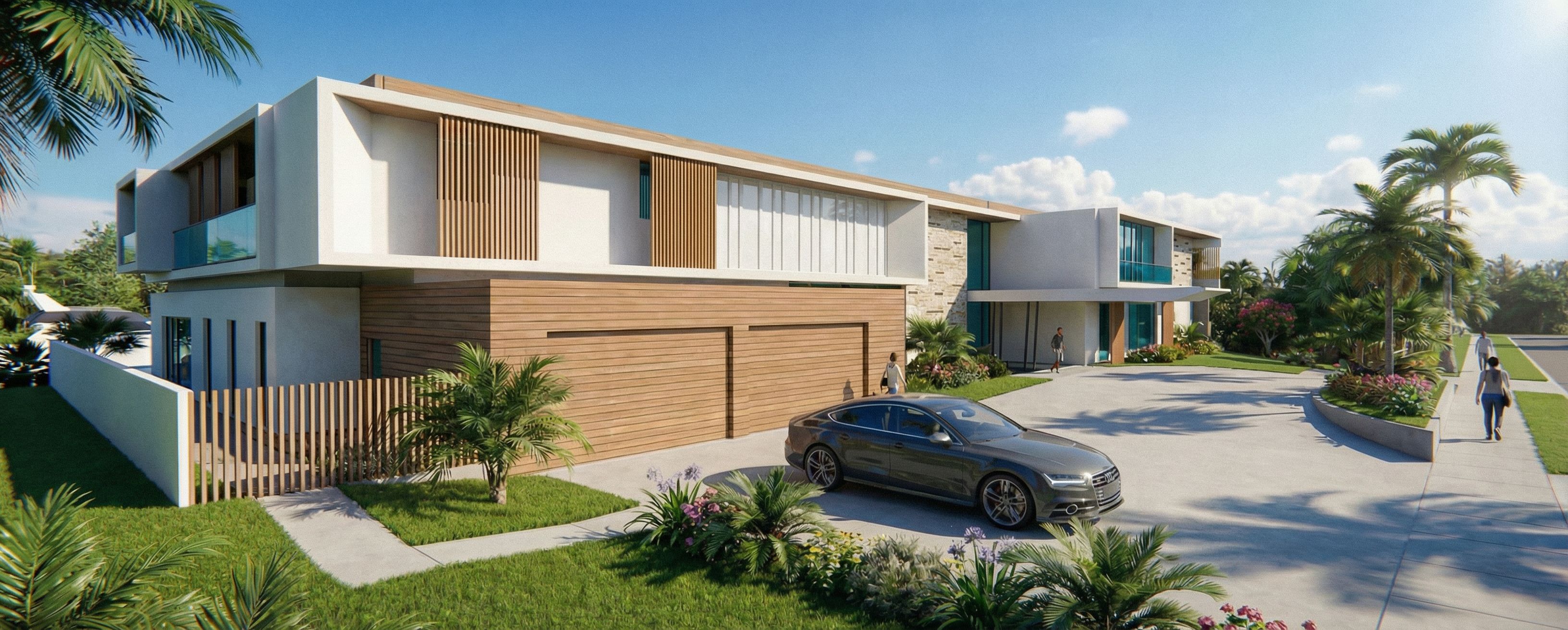 PromptCHANGE THE GLASS COLOR OF THE WINDOWS OVER THE GARAGE IN THE SECOND FLOOR FOR A WHITE COLOR. MOVER LOS PORTONES DEL GARAGE AL MISMO NIVEL DE LA FACHADA., keep exact camera angle